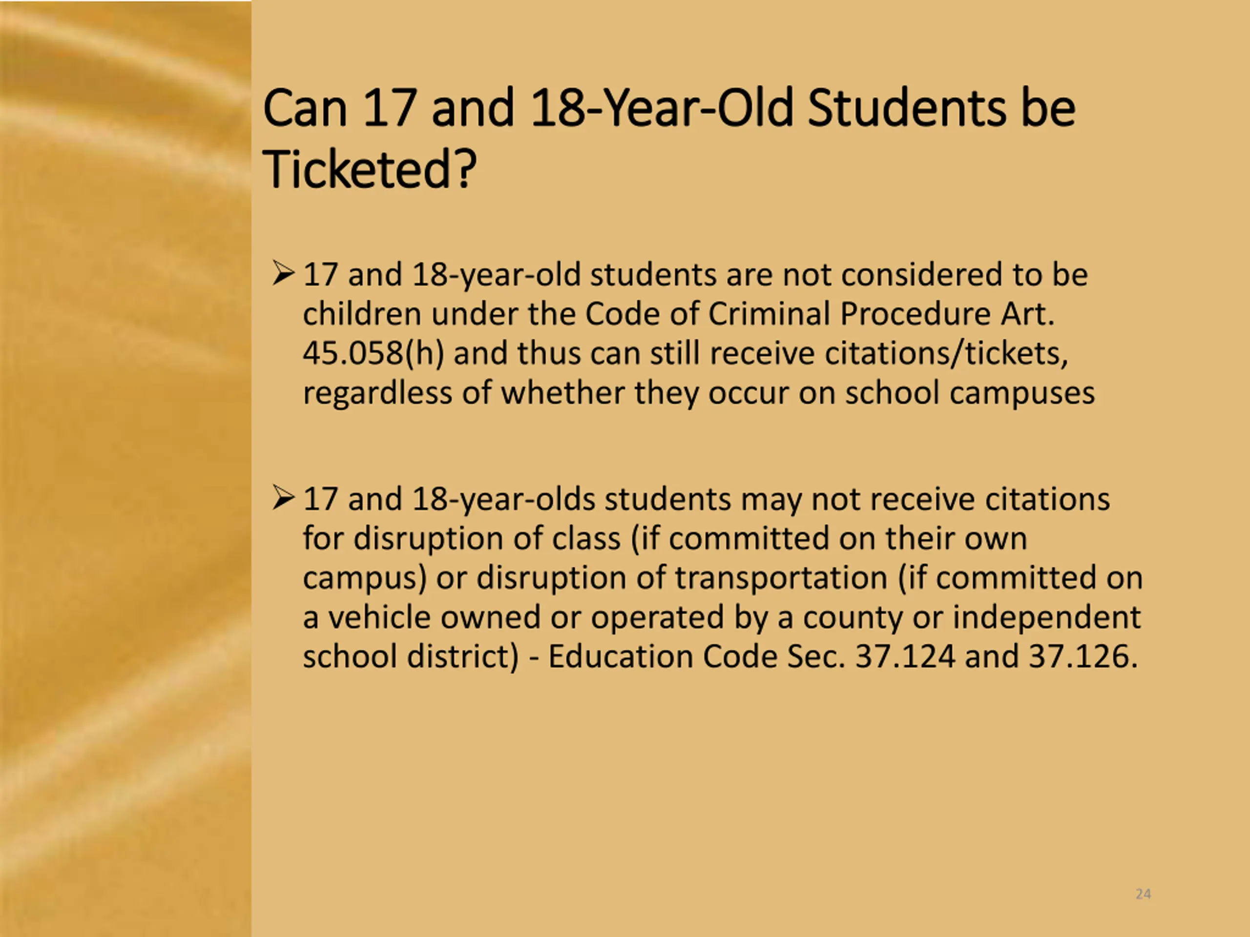 Can 17 and 18 Can 17 and 18- -Year Ticketed? Ticketed? Year- -Old Students be Old Students be 17 and 18-year-old students are not considered to be children under the Code of Criminal Procedure Art. 45.058(h) and thus can still receive citations/tickets, regardless of whether they occur on school campuses 17 and 18-year-olds students may not receive citations for disruption of class (if committed on their own campus) or disruption of transportation (if committed on a vehicle owned or operated by a county or independent school district) - Education Code Sec. 37.124 and 37.126. 24