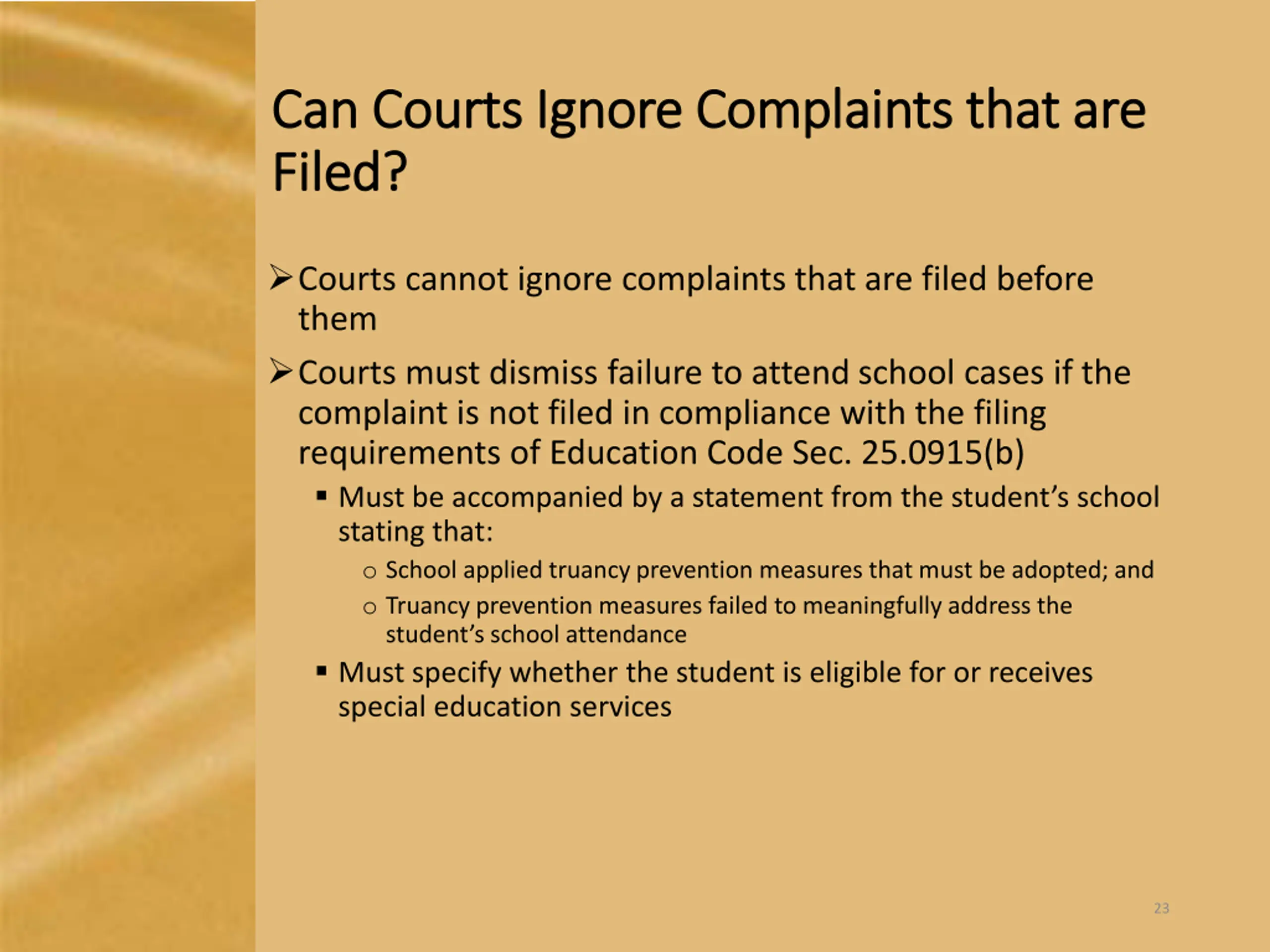 Can Courts Ignore Complaints that are Can Courts Ignore Complaints that are Filed? Filed? Courts cannot ignore complaints that are filed before them Courts must dismiss failure to attend school cases if the complaint is not filed in compliance with the filing requirements of Education Code Sec. 25.0915(b) Must be accompanied by a statement from the student s school stating that: o School applied truancy prevention measures that must be adopted; and o Truancy prevention measures failed to meaningfully address the student s school attendance Must specify whether the student is eligible for or receives special education services 23