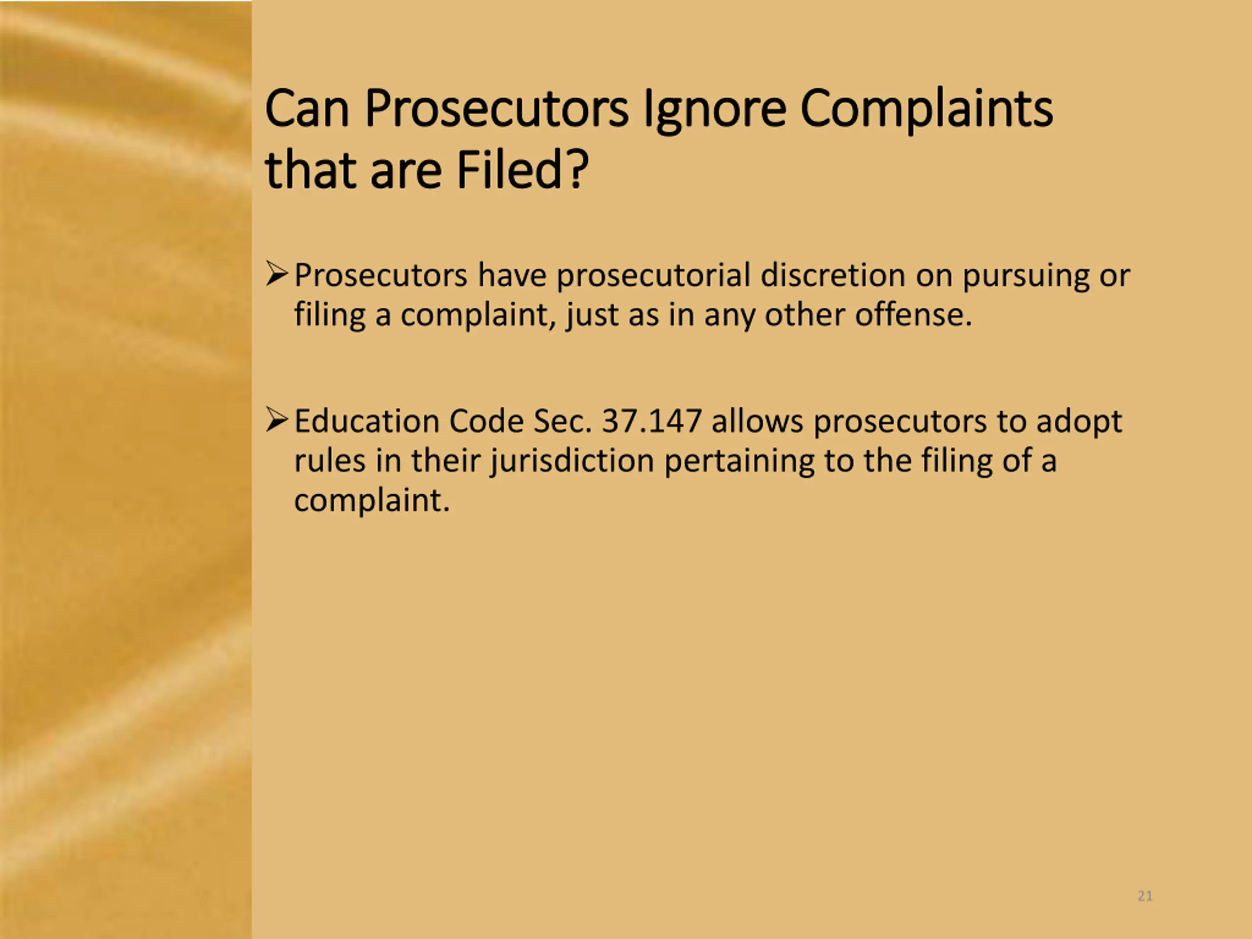 Can Prosecutors Ignore Complaints Can Prosecutors Ignore Complaints that are Filed? that are Filed? Prosecutors have prosecutorial discretion on pursuing or filing a complaint, just as in any other offense. Education Code Sec. 37.147 allows prosecutors to adopt rules in their jurisdiction pertaining to the filing of a complaint. 21