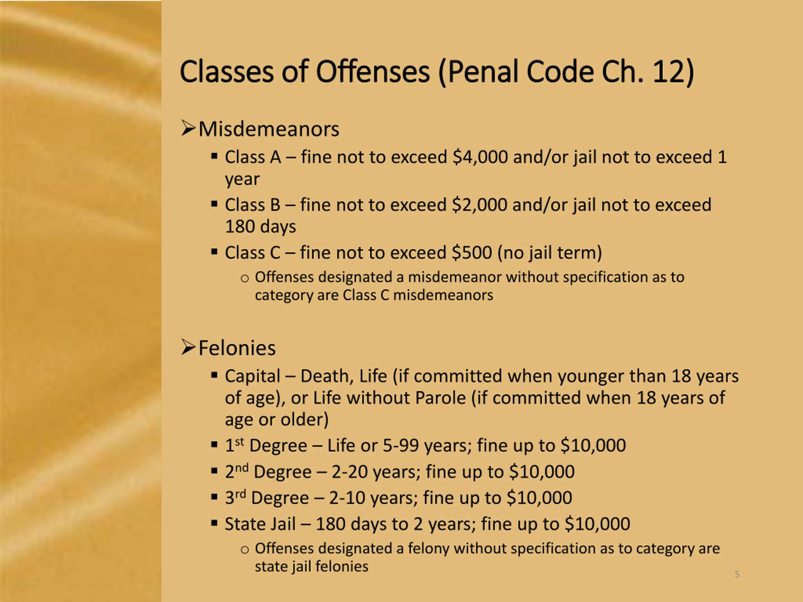 Classes of Offenses (Penal Code Ch. 12) Classes of Offenses (Penal Code Ch. 12) Misdemeanors Class A fine not to exceed $4,000 and/or jail not to exceed 1 year Class B fine not to exceed $2,000 and/or jail not to exceed 180 days Class C fine not to exceed $500 (no jail term) o Offenses designated a misdemeanor without specification as to category are Class C misdemeanors Felonies Capital Death, Life (if committed when younger than 18 years of age), or Life without Parole (if committed when 18 years of age or older) 1st Degree Life or 5-99 years; fine up to $10,000 2nd Degree 2-20 years; fine up to $10,000 3rd Degree 2-10 years; fine up to $10,000 State Jail 180 days to 2 years; fine up to $10,000 o Offenses designated a felony without specification as to category are state jail felonies 5