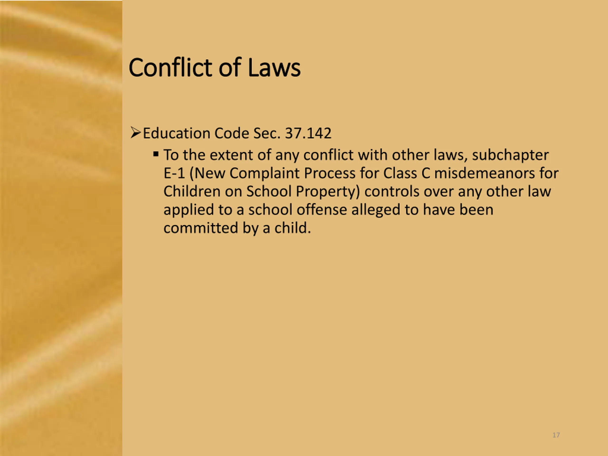 Conflict of Laws Conflict of Laws Education Code Sec. 37.142 To the extent of any conflict with other laws, subchapter E-1 (New Complaint Process for Class C misdemeanors for Children on School Property) controls over any other law applied to a school offense alleged to have been committed by a child. 17