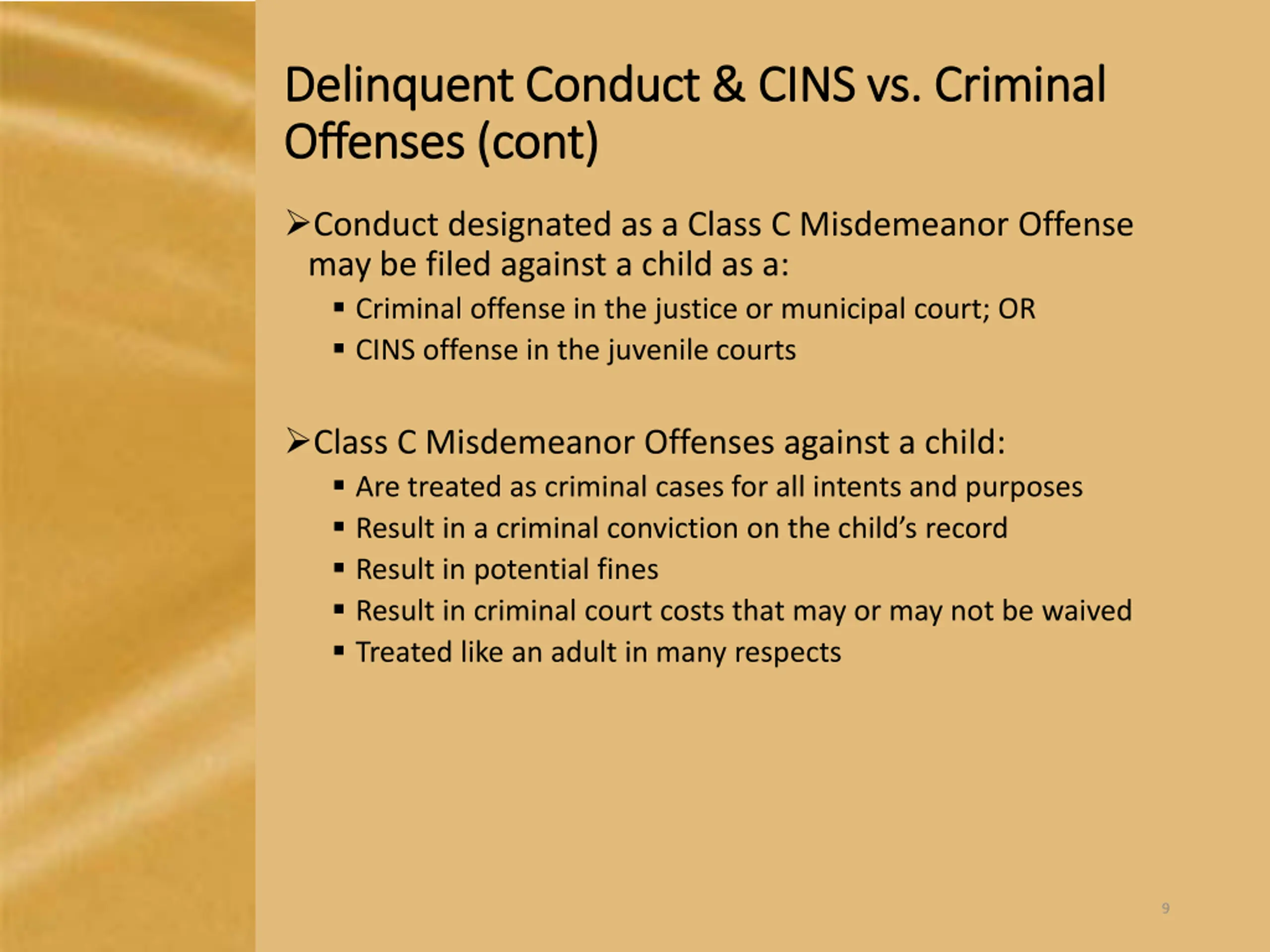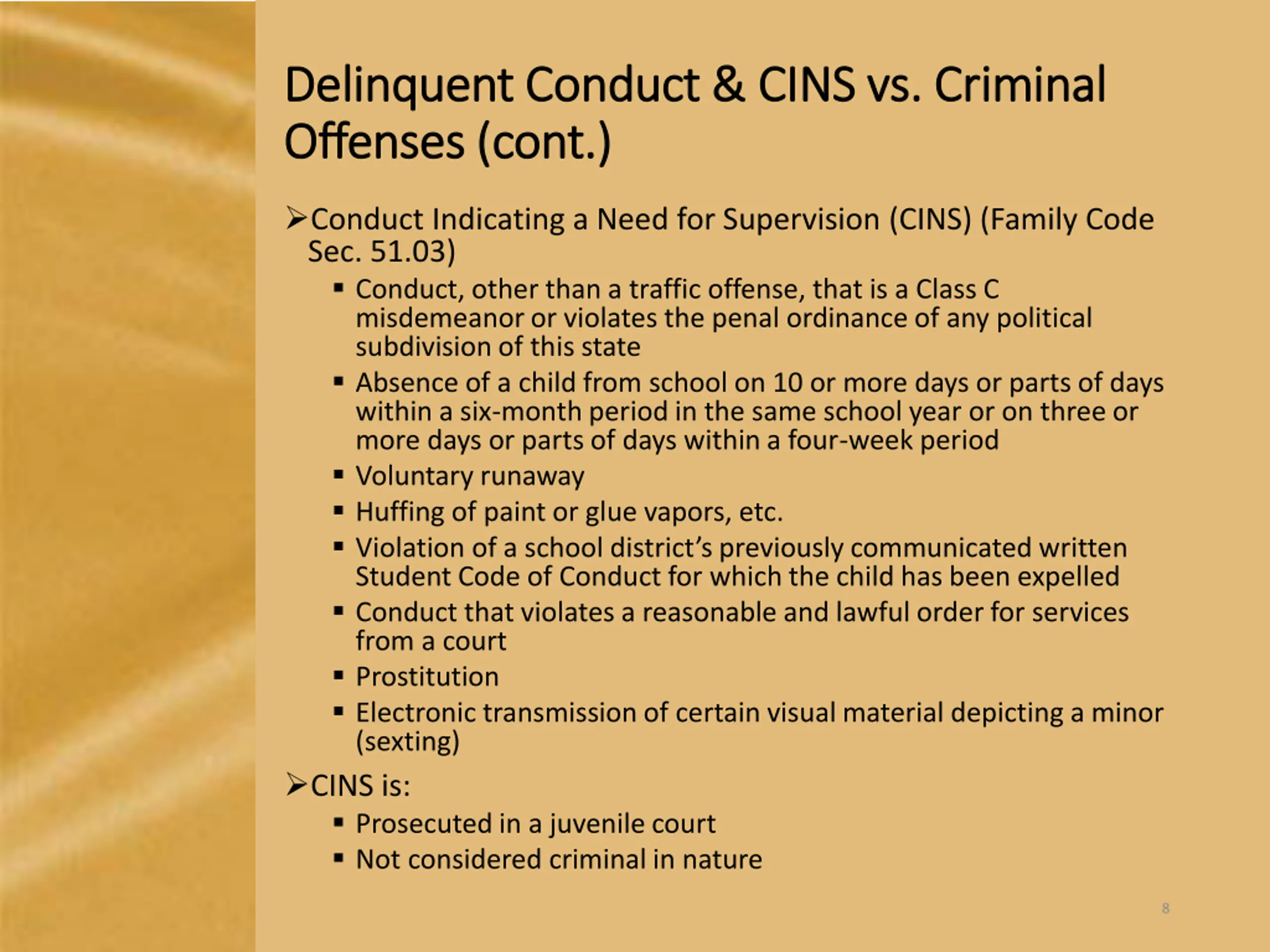 Delinquent Conduct & CINS vs. Criminal Delinquent Conduct & CINS vs. Criminal Offenses (cont.) Offenses (cont.) Conduct Indicating a Need for Supervision (CINS) (Family Code Sec. 51.03) Conduct, other than a traffic offense, that is a Class C misdemeanor or violates the penal ordinance of any political subdivision of this state Absence of a child from school on 10 or more days or parts of days within a six-month period in the same school year or on three or more days or parts of days within a four-week period Voluntary runaway Huffing of paint or glue vapors, etc. Violation of a school district s previously communicated written Student Code of Conduct for which the child has been expelled Conduct that violates a reasonable and lawful order for services from a court Prostitution Electronic transmission of certain visual material depicting a minor (sexting) CINS is: Prosecuted in a juvenile court Not considered criminal in nature 8