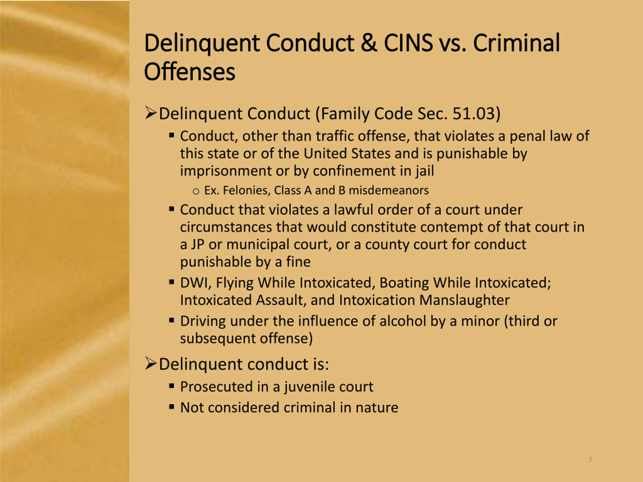 Delinquent Conduct & CINS vs. Criminal Delinquent Conduct & CINS vs. Criminal Offenses Offenses Delinquent Conduct (Family Code Sec. 51.03) Conduct, other than traffic offense, that violates a penal law of this state or of the United States and is punishable by imprisonment or by confinement in jail o Ex. Felonies, Class A and B misdemeanors Conduct that violates a lawful order of a court under circumstances that would constitute contempt of that court in a JP or municipal court, or a county court for conduct punishable by a fine DWI, Flying While Intoxicated, Boating While Intoxicated; Intoxicated Assault, and Intoxication Manslaughter Driving under the influence of alcohol by a minor (third or subsequent offense) Delinquent conduct is: Prosecuted in a juvenile court Not considered criminal in nature 7