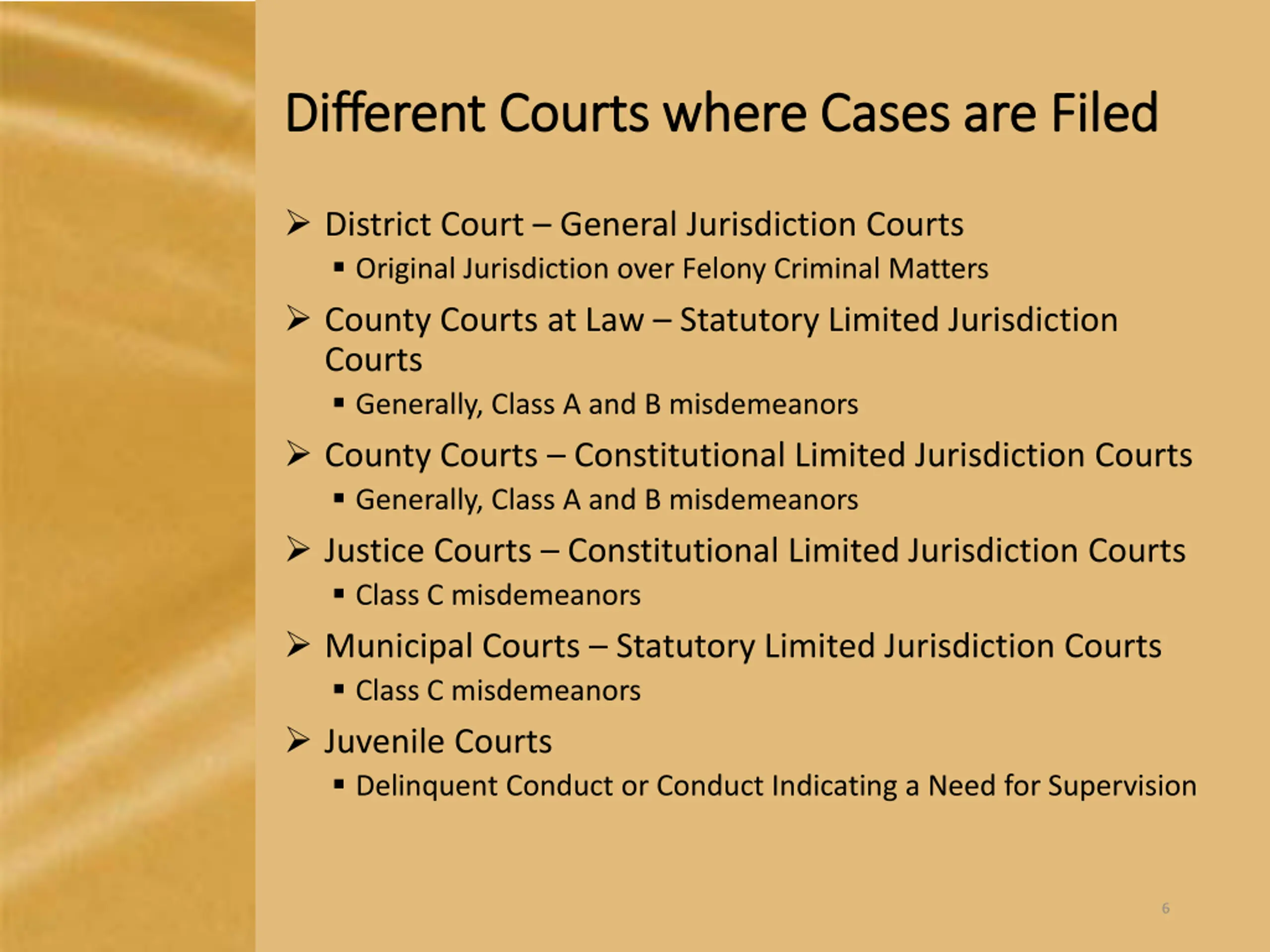 Different Courts where Cases are Filed Different Courts where Cases are Filed District Court General Jurisdiction Courts Original Jurisdiction over Felony Criminal Matters County Courts at Law Statutory Limited Jurisdiction Courts Generally, Class A and B misdemeanors County Courts Constitutional Limited Jurisdiction Courts Generally, Class A and B misdemeanors Justice Courts Constitutional Limited Jurisdiction Courts Class C misdemeanors Municipal Courts Statutory Limited Jurisdiction Courts Class C misdemeanors Juvenile Courts Delinquent Conduct or Conduct Indicating a Need for Supervision 6