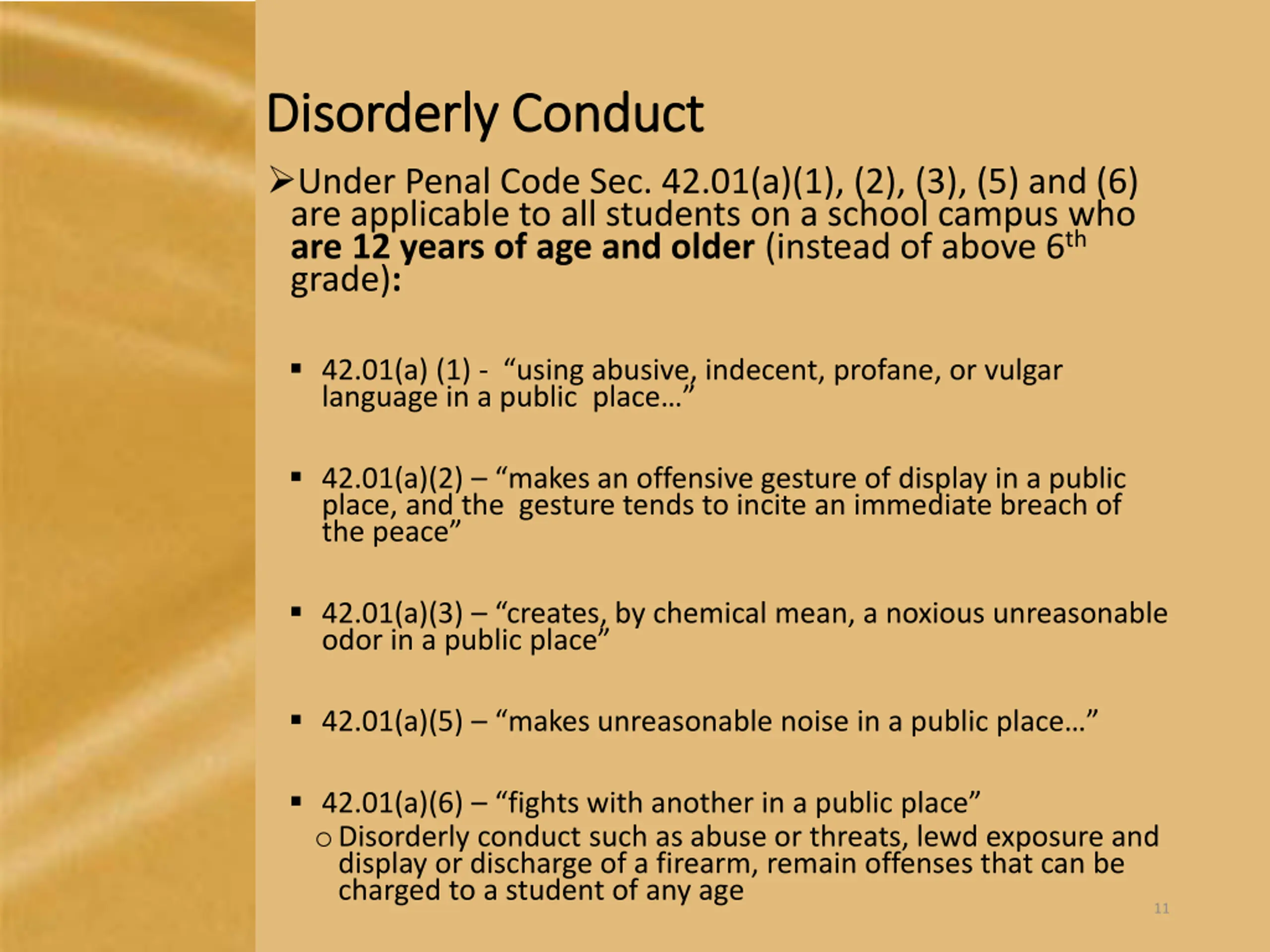 Disorderly Conduct Disorderly Conduct Under Penal Code Sec. 42.01(a)(1), (2), (3), (5) and (6) are applicable to all students on a school campus who are 12 years of age and older (instead of above 6th grade): 42.01(a) (1) - using abusive, indecent, profane, or vulgar language in a public place 42.01(a)(2) makes an offensive gesture of display in a public place, and the gesture tends to incite an immediate breach of the peace 42.01(a)(3) creates, by chemical mean, a noxious unreasonable odor in a public place 42.01(a)(5) makes unreasonable noise in a public place 42.01(a)(6) fights with another in a public place oDisorderly conduct such as abuse or threats, lewd exposure and display or discharge of a firearm, remain offenses that can be charged to a student of any age 11