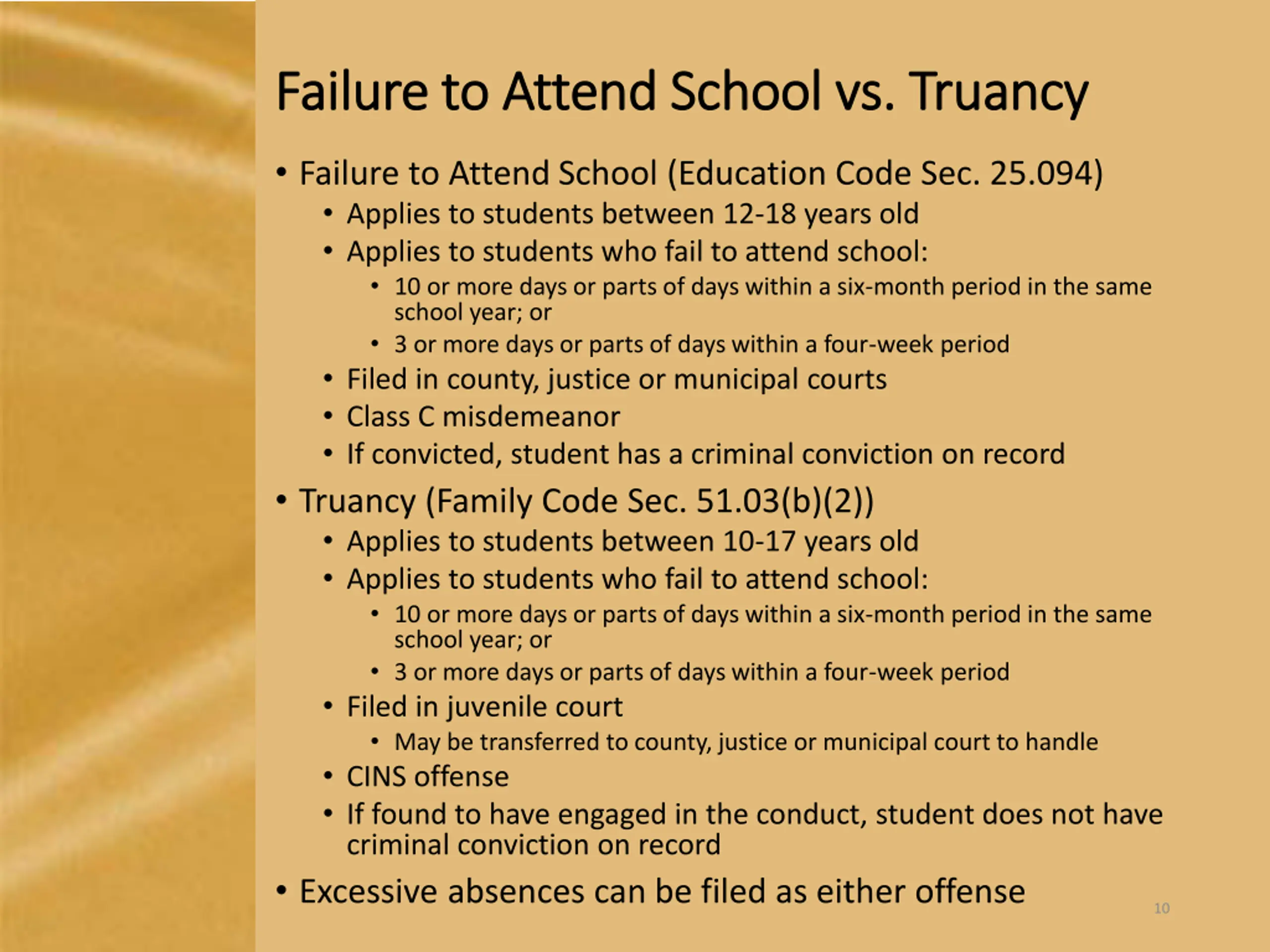 Failure to Attend School vs. Truancy Failure to Attend School vs. Truancy Failure to Attend School (Education Code Sec. 25.094) Applies to students between 12-18 years old Applies to students who fail to attend school: 10 or more days or parts of days within a six-month period in the same school year; or 3 or more days or parts of days within a four-week period Filed in county, justice or municipal courts Class C misdemeanor If convicted, student has a criminal conviction on record Truancy (Family Code Sec. 51.03(b)(2)) Applies to students between 10-17 years old Applies to students who fail to attend school: 10 or more days or parts of days within a six-month period in the same school year; or 3 or more days or parts of days within a four-week period Filed in juvenile court May be transferred to county, justice or municipal court to handle CINS offense If found to have engaged in the conduct, student does not have criminal conviction on record Excessive absences can be filed as either offense 10