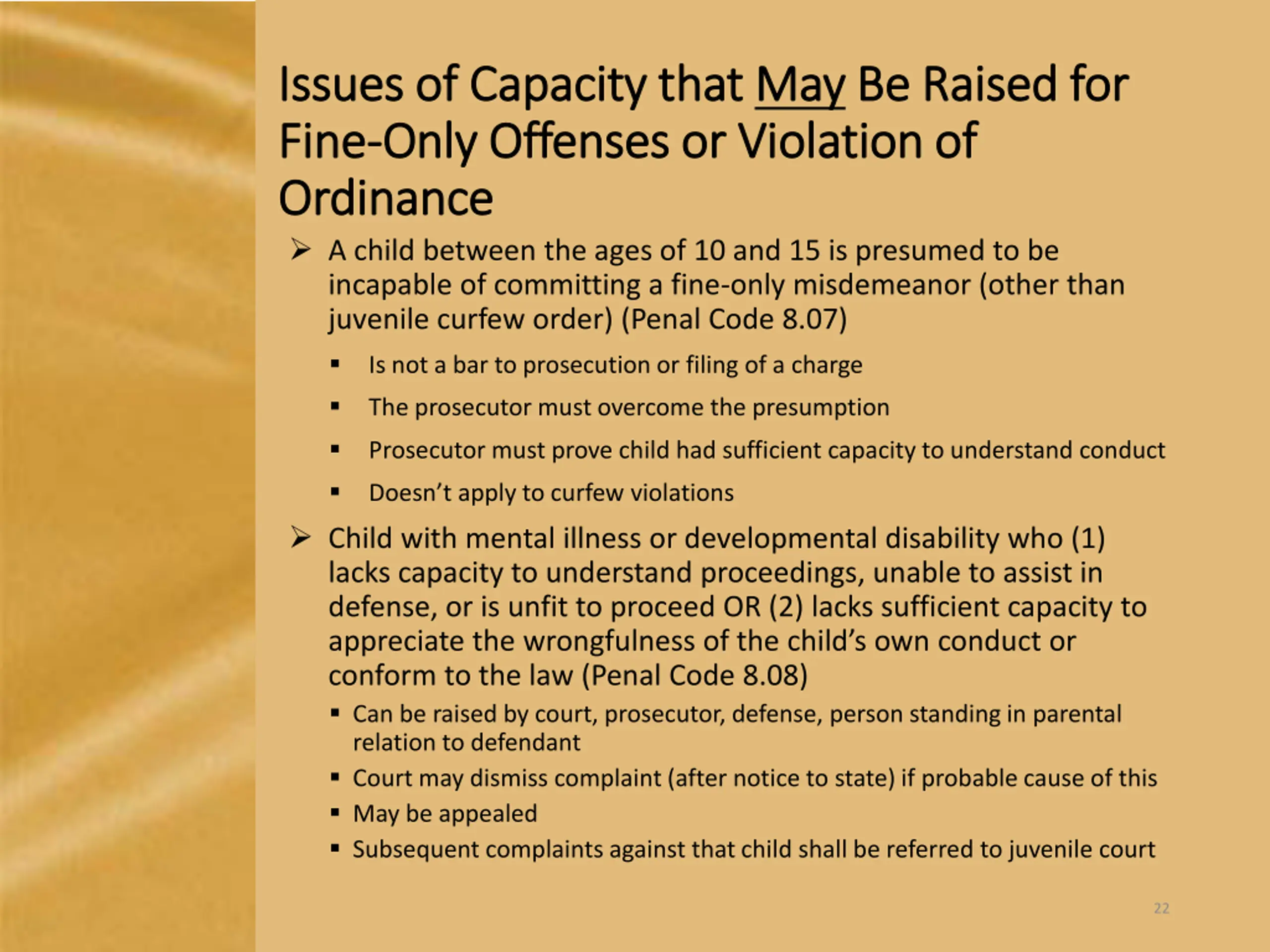 Issues of Capacity that Issues of Capacity that May Fine Fine- -Only Offenses or Violation of Only Offenses or Violation of Ordinance Ordinance A child between the ages of 10 and 15 is presumed to be incapable of committing a fine-only misdemeanor (other than juvenile curfew order) (Penal Code 8.07) Is not a bar to prosecution or filing of a charge The prosecutor must overcome the presumption Prosecutor must prove child had sufficient capacity to understand conduct Doesn t apply to curfew violations Child with mental illness or developmental disability who (1) lacks capacity to understand proceedings, unable to assist in defense, or is unfit to proceed OR (2) lacks sufficient capacity to appreciate the wrongfulness of the child s own conduct or conform to the law (Penal Code 8.08) Can be raised by court, prosecutor, defense, person standing in parental relation to defendant Court may dismiss complaint (after notice to state) if probable cause of this May be appealed Subsequent complaints against that child shall be referred to juvenile court May Be Raised for Be Raised for 22