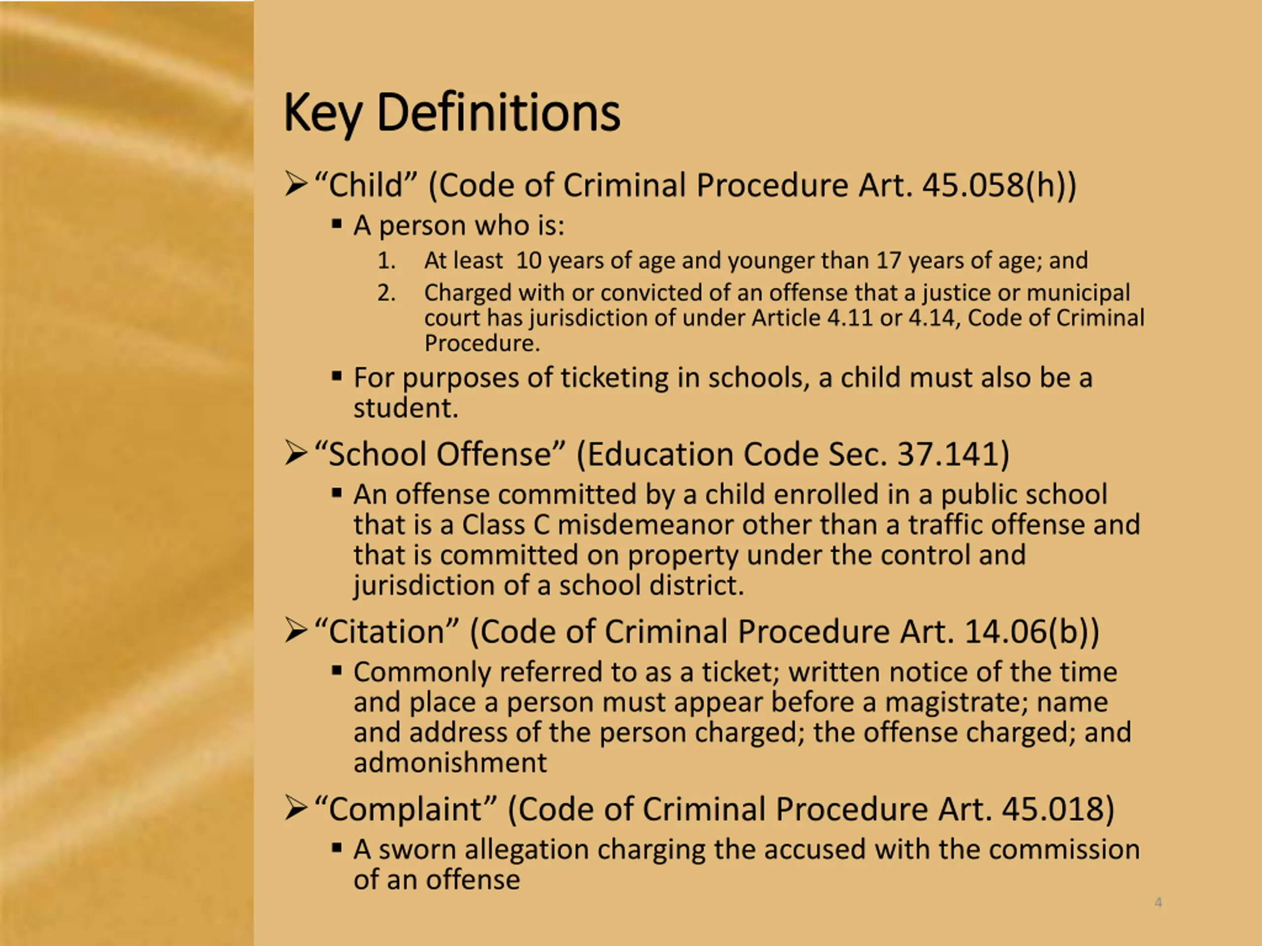 Key Definitions Key Definitions Child (Code of Criminal Procedure Art. 45.058(h)) A person who is: 1. At least 10 years of age and younger than 17 years of age; and 2. Charged with or convicted of an offense that a justice or municipal court has jurisdiction of under Article 4.11 or 4.14, Code of Criminal Procedure. For purposes of ticketing in schools, a child must also be a student. School Offense (Education Code Sec. 37.141) An offense committed by a child enrolled in a public school that is a Class C misdemeanor other than a traffic offense and that is committed on property under the control and jurisdiction of a school district. Citation (Code of Criminal Procedure Art. 14.06(b)) Commonly referred to as a ticket; written notice of the time and place a person must appear before a magistrate; name and address of the person charged; the offense charged; and admonishment Complaint (Code of Criminal Procedure Art. 45.018) A sworn allegation charging the accused with the commission of an offense 4