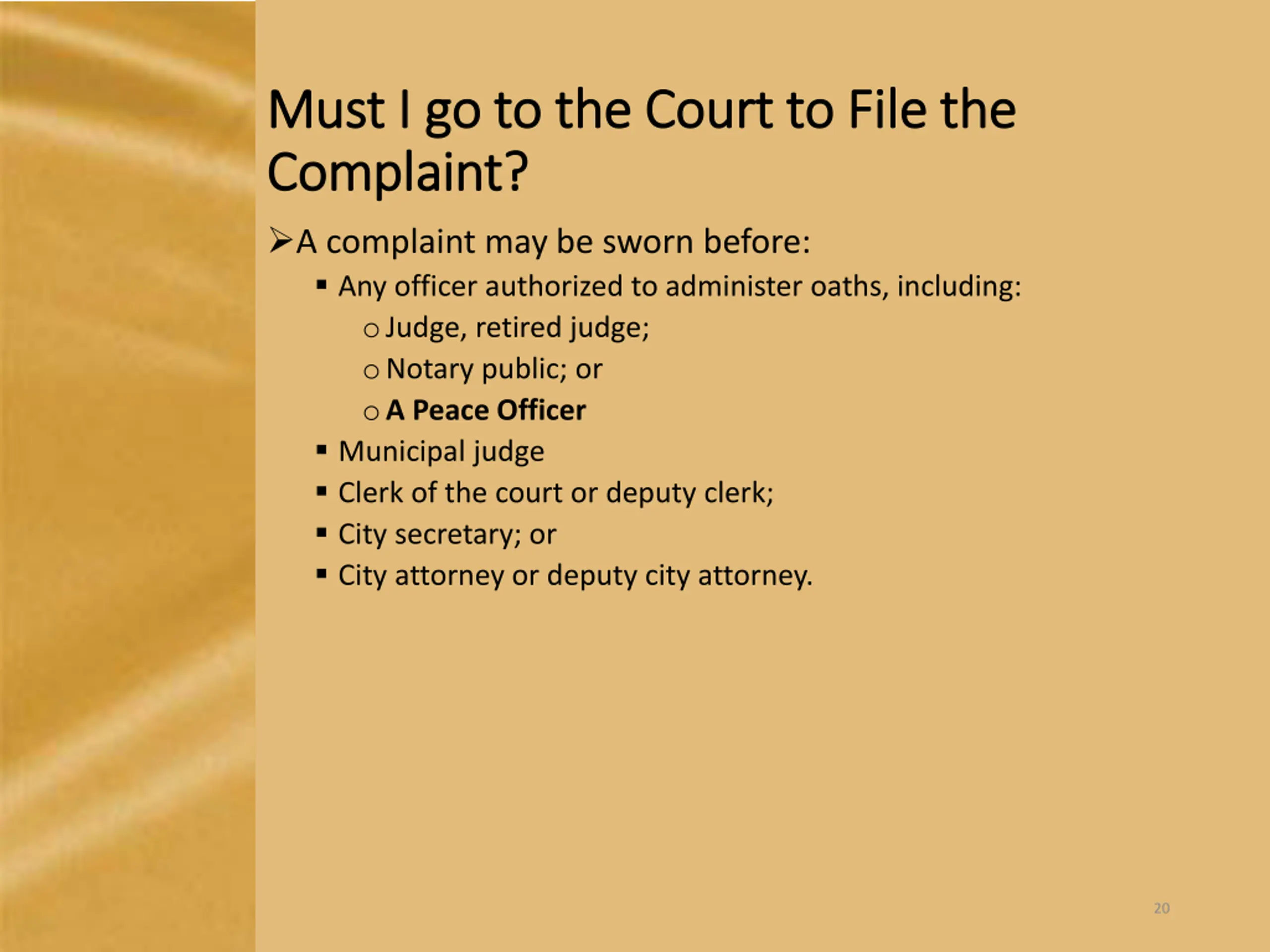 Must I go to the Court to File the Must I go to the Court to File the Complaint? Complaint? A complaint may be sworn before: Any officer authorized to administer oaths, including: oJudge, retired judge; oNotary public; or oA Peace Officer Municipal judge Clerk of the court or deputy clerk; City secretary; or City attorney or deputy city attorney. 20