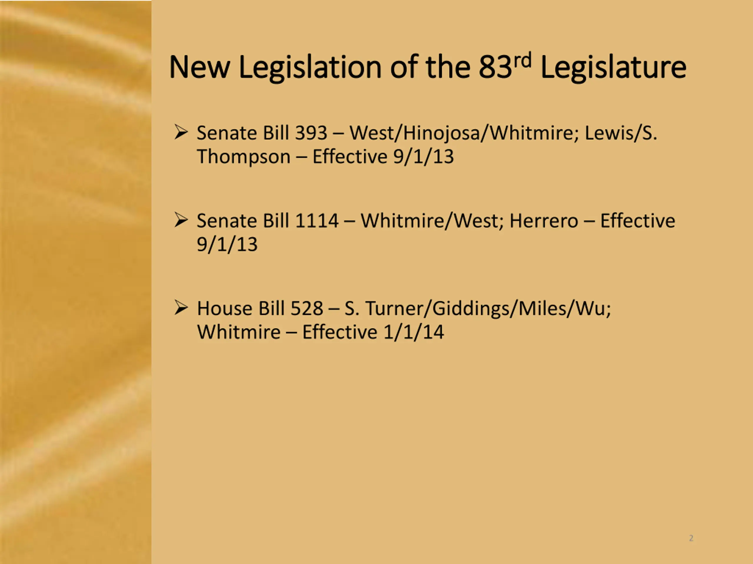 New Legislation of the 83 New Legislation of the 83rd rd Legislature Legislature Senate Bill 393 West/Hinojosa/Whitmire; Lewis/S. Thompson Effective 9/1/13 Senate Bill 1114 Whitmire/West; Herrero Effective 9/1/13 House Bill 528 S. Turner/Giddings/Miles/Wu; Whitmire Effective 1/1/14 2