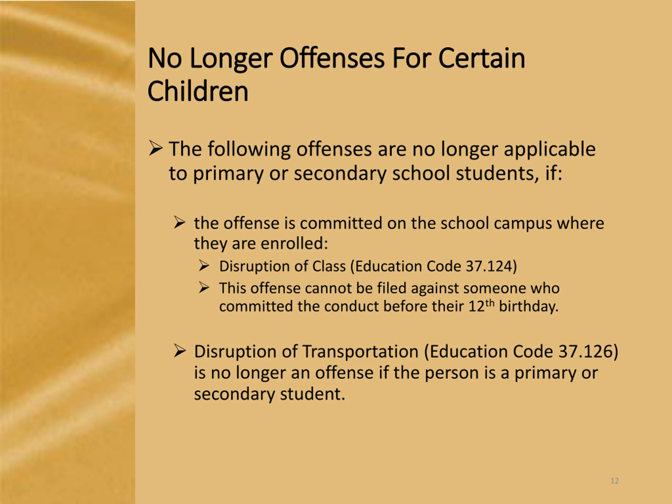 No Longer Offenses For Certain No Longer Offenses For Certain Children Children The following offenses are no longer applicable to primary or secondary school students, if: the offense is committed on the school campus where they are enrolled: Disruption of Class (Education Code 37.124) This offense cannot be filed against someone who committed the conduct before their 12th birthday. Disruption of Transportation (Education Code 37.126) is no longer an offense if the person is a primary or secondary student. 12