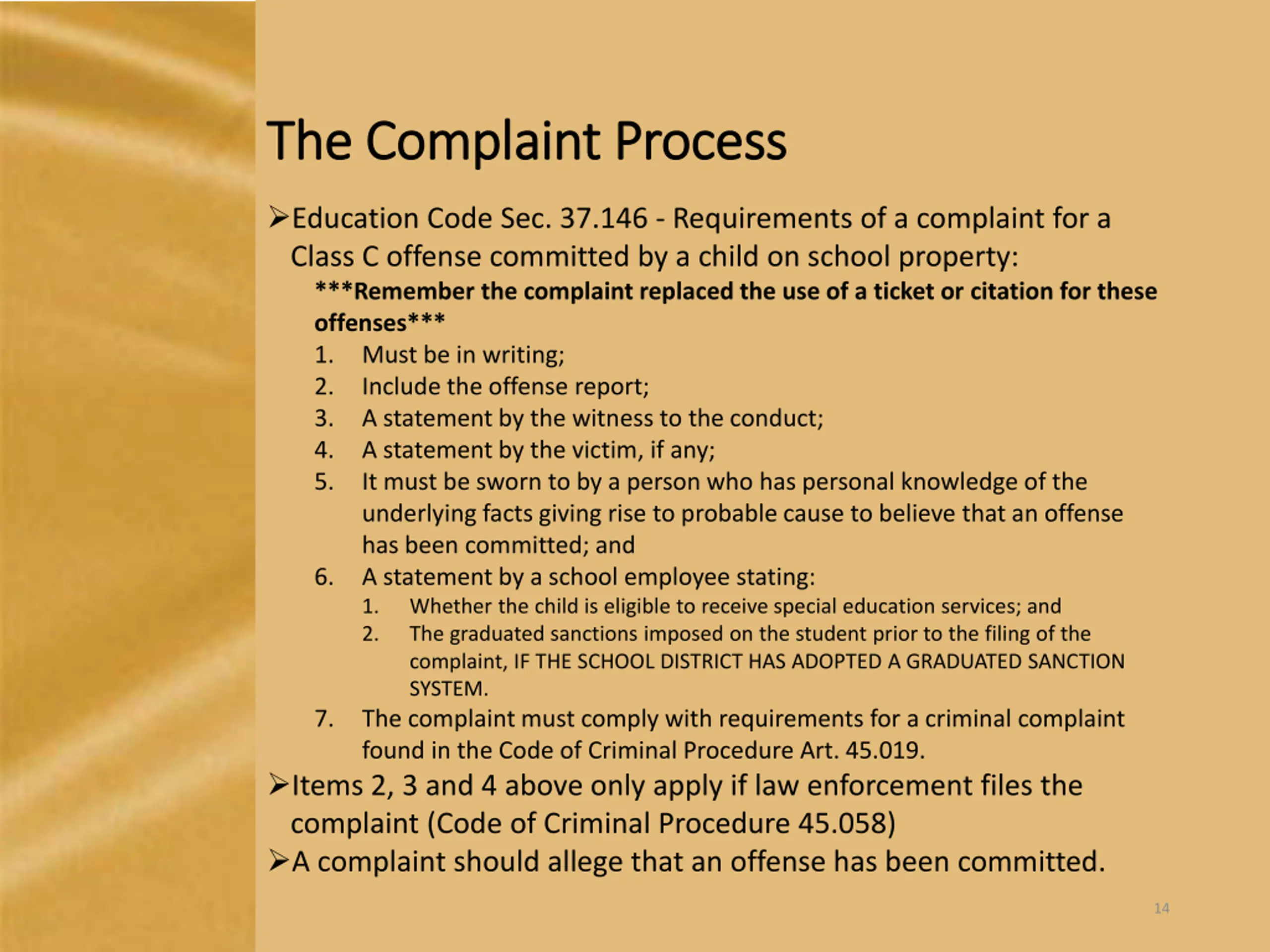 The Complaint Process The Complaint Process Education Code Sec. 37.146 - Requirements of a complaint for a Class C offense committed by a child on school property: ***Remember the complaint replaced the use of a ticket or citation for these offenses*** 1. Must be in writing; 2. Include the offense report; 3. A statement by the witness to the conduct; 4. A statement by the victim, if any; 5. It must be sworn to by a person who has personal knowledge of the underlying facts giving rise to probable cause to believe that an offense has been committed; and 6. A statement by a school employee stating: 1. Whether the child is eligible to receive special education services; and 2. The graduated sanctions imposed on the student prior to the filing of the complaint, IF THE SCHOOL DISTRICT HAS ADOPTED A GRADUATED SANCTION SYSTEM. 7. The complaint must comply with requirements for a criminal complaint found in the Code of Criminal Procedure Art. 45.019. Items 2, 3 and 4 above only apply if law enforcement files the complaint (Code of Criminal Procedure 45.058) A complaint should allege that an offense has been committed. 14