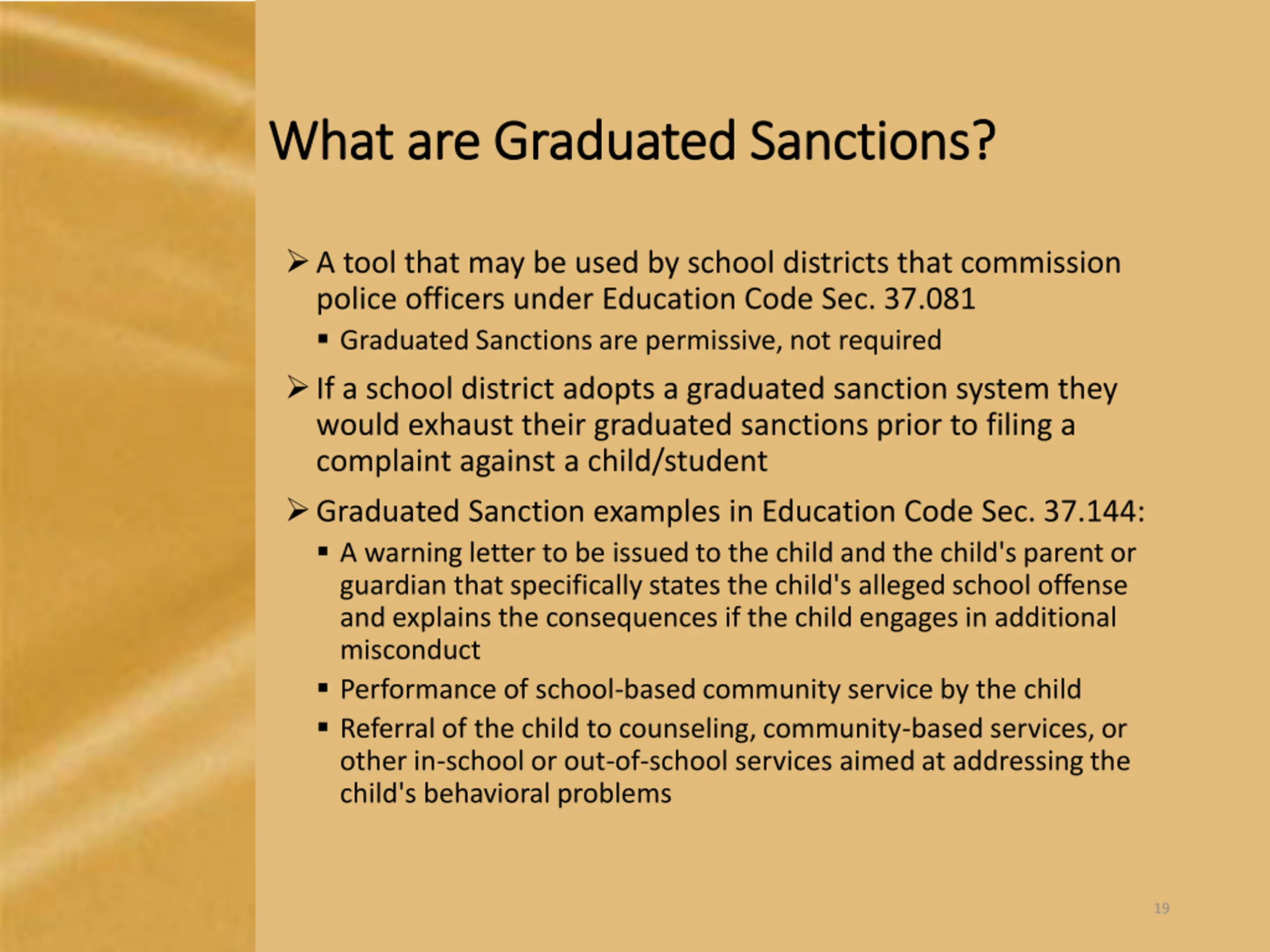 What are Graduated Sanctions? What are Graduated Sanctions? A tool that may be used by school districts that commission police officers under Education Code Sec. 37.081 Graduated Sanctions are permissive, not required If a school district adopts a graduated sanction system they would exhaust their graduated sanctions prior to filing a complaint against a child/student Graduated Sanction examples in Education Code Sec. 37.144: A warning letter to be issued to the child and the child's parent or guardian that specifically states the child's alleged school offense and explains the consequences if the child engages in additional misconduct Performance of school-based community service by the child Referral of the child to counseling, community-based services, or other in-school or out-of-school services aimed at addressing the child's behavioral problems 19