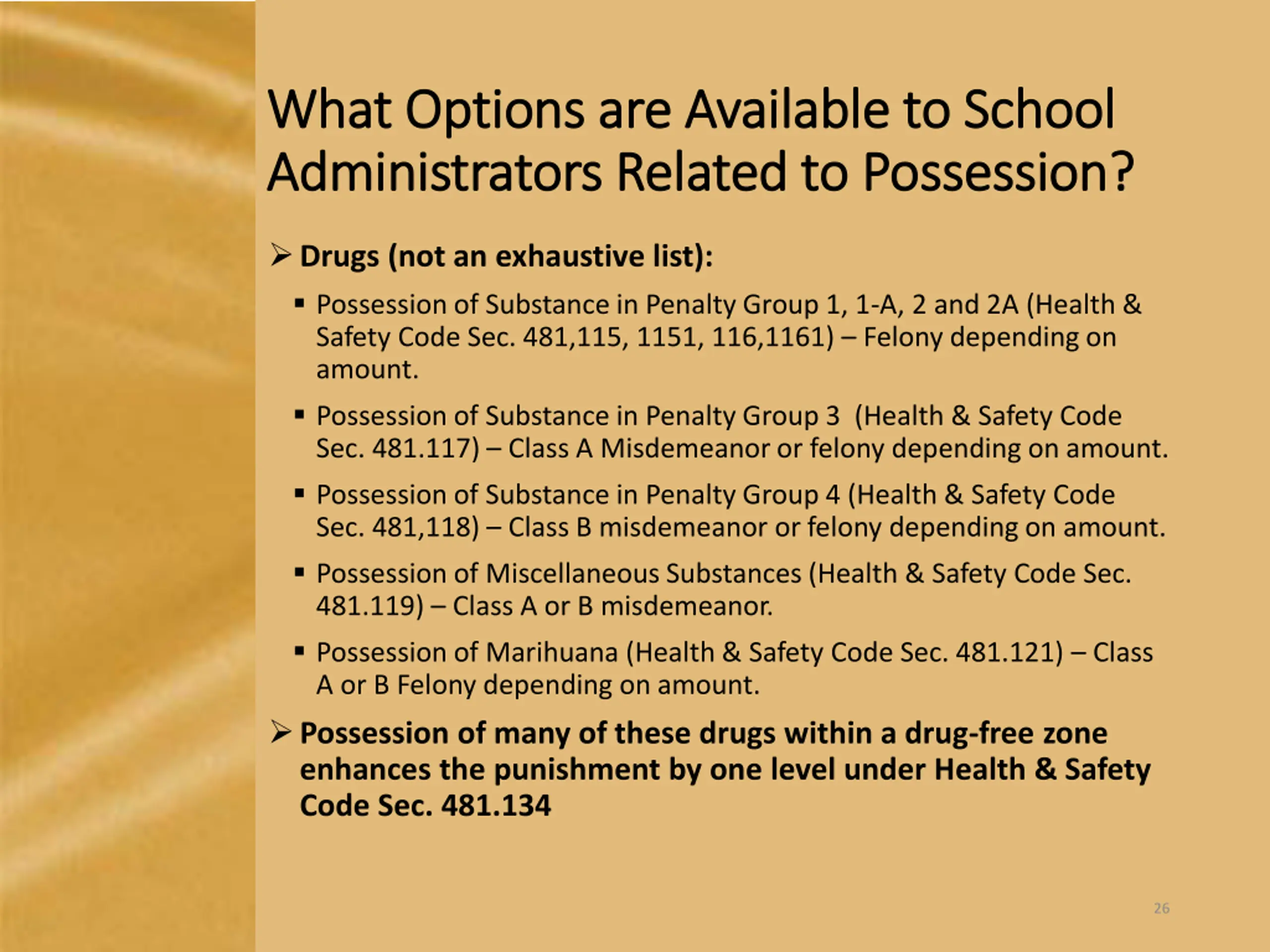 What Options are Available to School What Options are Available to School A Administrators dministrators R Related to Possession? elated to Possession? Drugs (not an exhaustive list): Possession of Substance in Penalty Group 1, 1-A, 2 and 2A (Health & Safety Code Sec. 481,115, 1151, 116,1161) Felony depending on amount. Possession of Substance in Penalty Group 3 (Health & Safety Code Sec. 481.117) Class A Misdemeanor or felony depending on amount. Possession of Substance in Penalty Group 4 (Health & Safety Code Sec. 481,118) Class B misdemeanor or felony depending on amount. Possession of Miscellaneous Substances (Health & Safety Code Sec. 481.119) Class A or B misdemeanor. Possession of Marihuana (Health & Safety Code Sec. 481.121) Class A or B Felony depending on amount. Possession of many of these drugs within a drug-free zone enhances the punishment by one level under Health & Safety Code Sec. 481.134 26