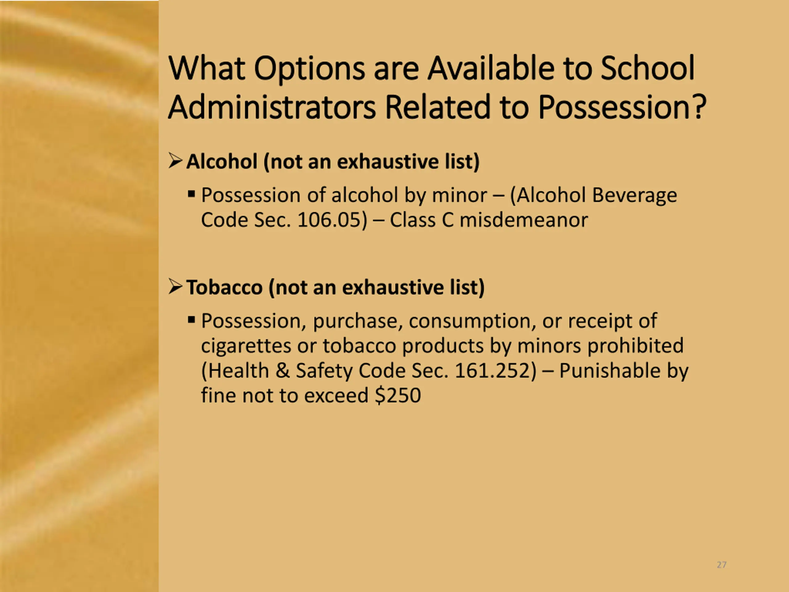 What Options are Available to School What Options are Available to School Administrators Related to Possession? Administrators Related to Possession? Alcohol (not an exhaustive list) Possession of alcohol by minor (Alcohol Beverage Code Sec. 106.05) Class C misdemeanor Tobacco (not an exhaustive list) Possession, purchase, consumption, or receipt of cigarettes or tobacco products by minors prohibited (Health & Safety Code Sec. 161.252) Punishable by fine not to exceed $250 27