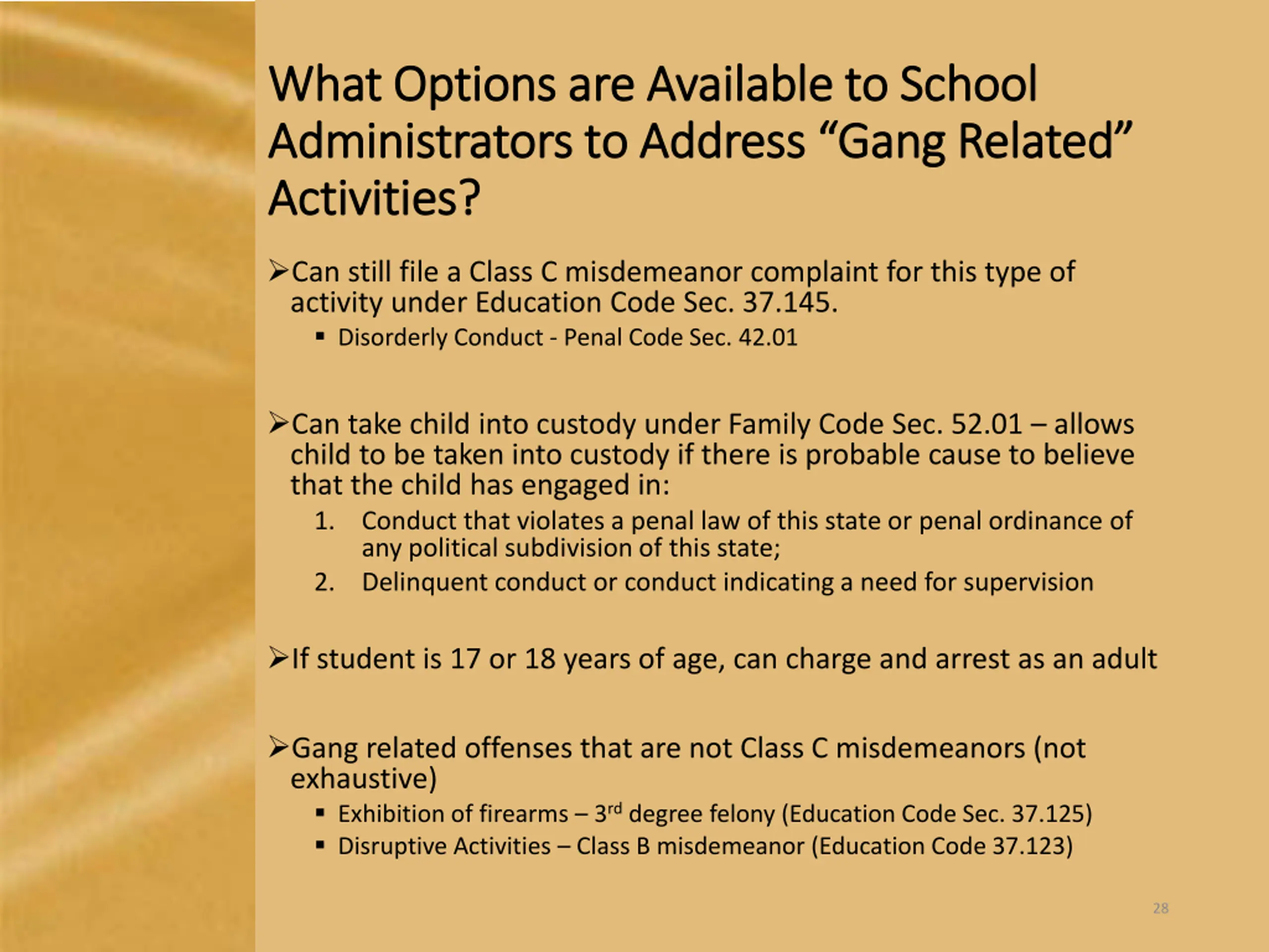 What Options are Available to School What Options are Available to School Administrators to Address Gang Related Administrators to Address Gang Related Activities? Activities? Can still file a Class C misdemeanor complaint for this type of activity under Education Code Sec. 37.145. Disorderly Conduct - Penal Code Sec. 42.01 Can take child into custody under Family Code Sec. 52.01 allows child to be taken into custody if there is probable cause to believe that the child has engaged in: 1. Conduct that violates a penal law of this state or penal ordinance of any political subdivision of this state; 2. Delinquent conduct or conduct indicating a need for supervision If student is 17 or 18 years of age, can charge and arrest as an adult Gang related offenses that are not Class C misdemeanors (not exhaustive) Exhibition of firearms 3rd degree felony (Education Code Sec. 37.125) Disruptive Activities Class B misdemeanor (Education Code 37.123) 28