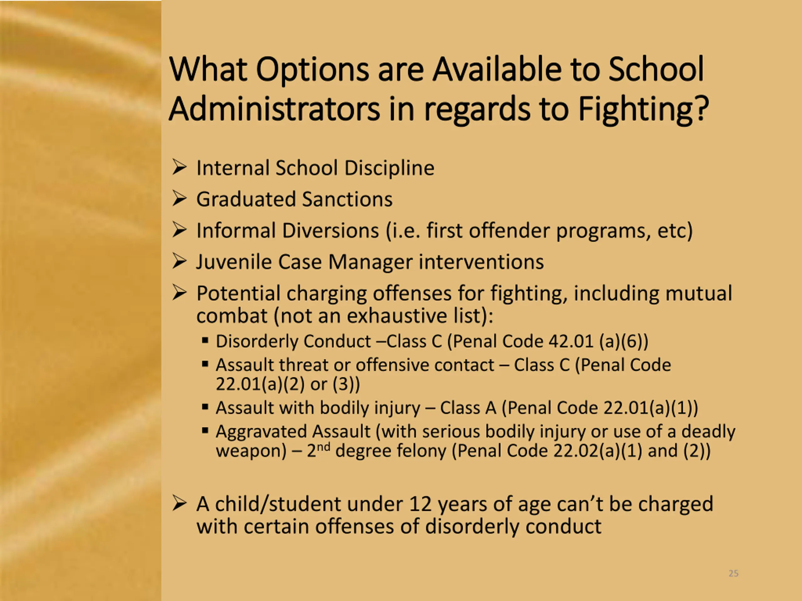 What Options are Available to School What Options are Available to School Administrators in regards to Fighting? Administrators in regards to Fighting? Internal School Discipline Graduated Sanctions Informal Diversions (i.e. first offender programs, etc) Juvenile Case Manager interventions Potential charging offenses for fighting, including mutual combat (not an exhaustive list): Disorderly Conduct Class C (Penal Code 42.01 (a)(6)) Assault threat or offensive contact Class C (Penal Code 22.01(a)(2) or (3)) Assault with bodily injury Class A (Penal Code 22.01(a)(1)) Aggravated Assault (with serious bodily injury or use of a deadly weapon) 2nd degree felony (Penal Code 22.02(a)(1) and (2)) A child/student under 12 years of age can t be charged with certain offenses of disorderly conduct 25