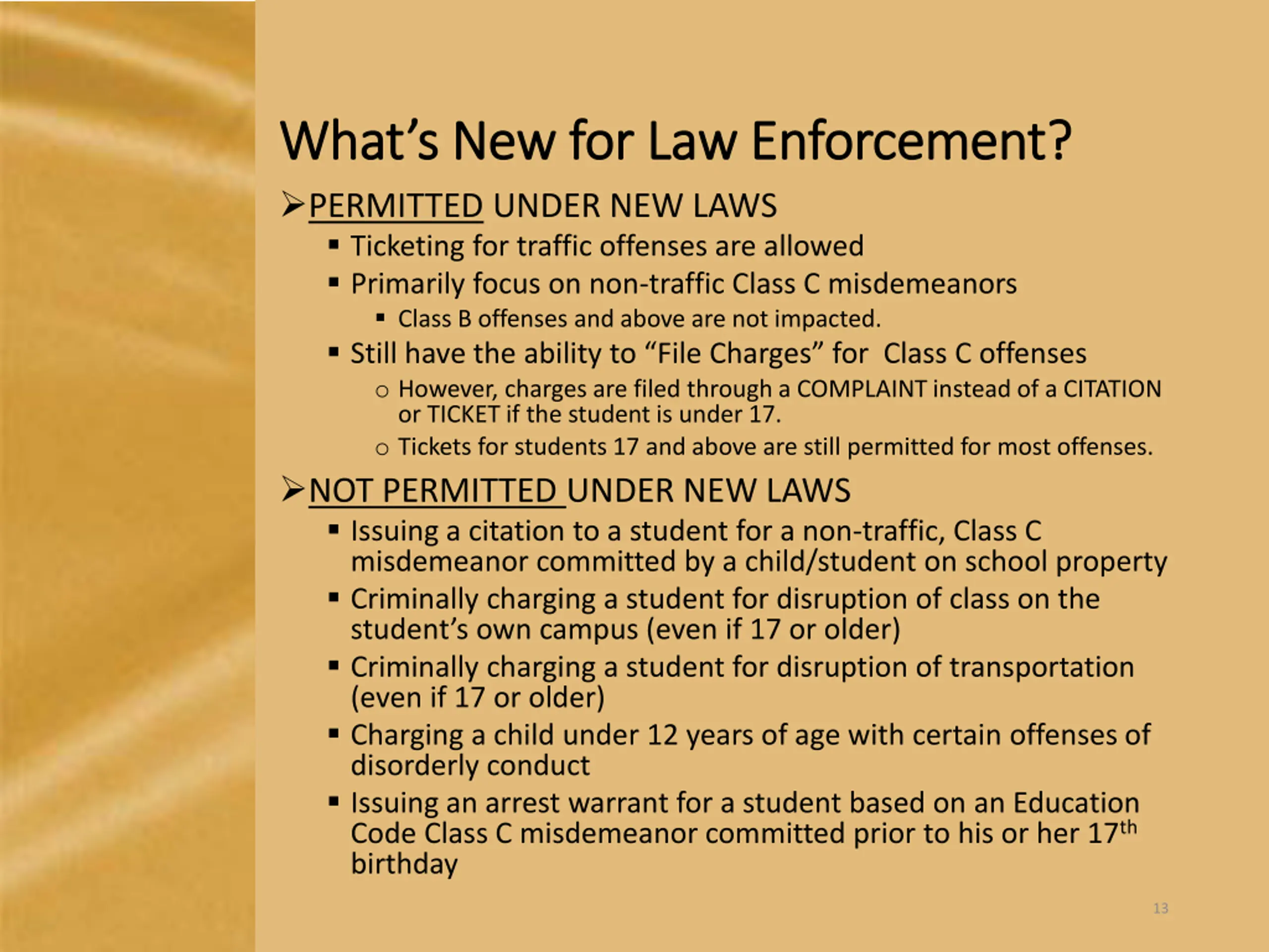 Whats New for Law Enforcement? What s New for Law Enforcement? PERMITTED UNDER NEW LAWS Ticketing for traffic offenses are allowed Primarily focus on non-traffic Class C misdemeanors Class B offenses and above are not impacted. Still have the ability to File Charges for Class C offenses o However, charges are filed through a COMPLAINT instead of a CITATION or TICKET if the student is under 17. o Tickets for students 17 and above are still permitted for most offenses. NOT PERMITTED UNDER NEW LAWS Issuing a citation to a student for a non-traffic, Class C misdemeanor committed by a child/student on school property Criminally charging a student for disruption of class on the student s own campus (even if 17 or older) Criminally charging a student for disruption of transportation (even if 17 or older) Charging a child under 12 years of age with certain offenses of disorderly conduct Issuing an arrest warrant for a student based on an Education Code Class C misdemeanor committed prior to his or her 17th birthday 13