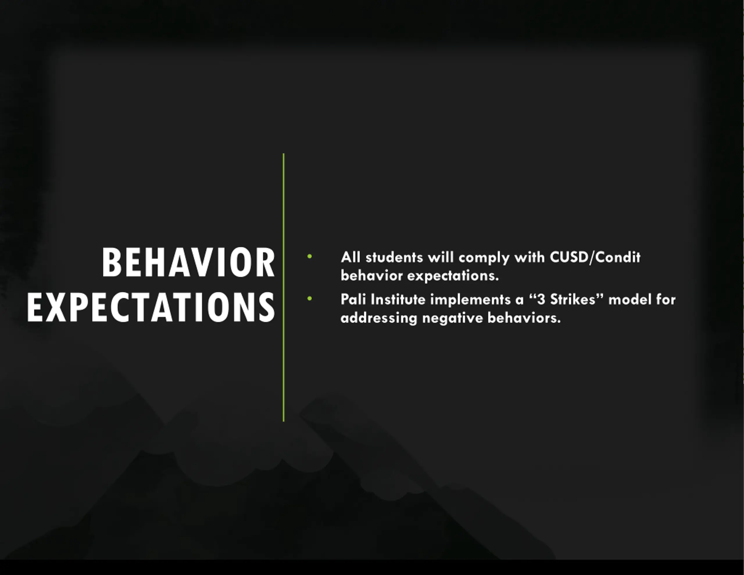 BEHAVIOR EXPECTATIONS All students will comply with CUSD/Condit behavior expectations. Pali Institute implements a 3 Strikes model for addressing negative behaviors.