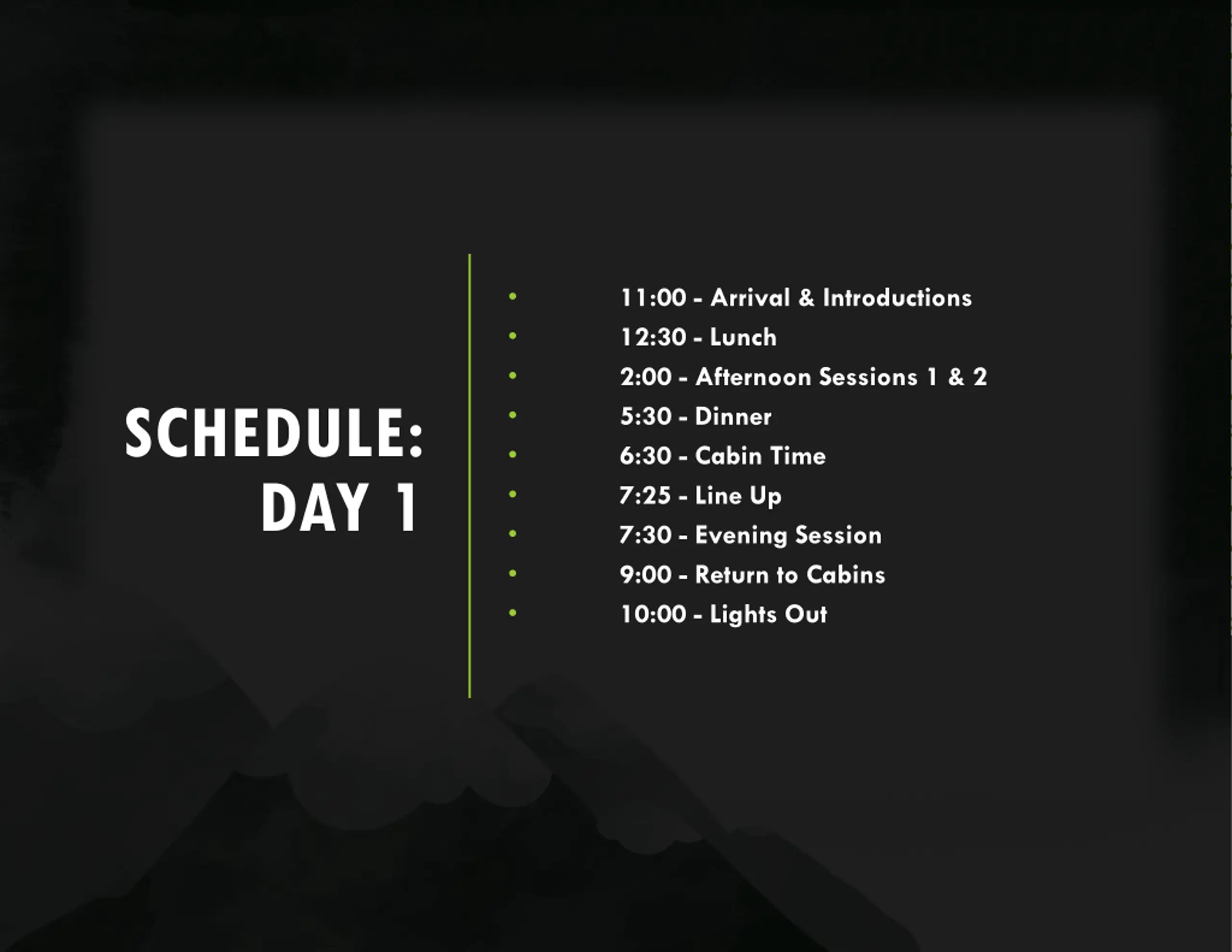 11:00 - Arrival & Introductions 12:30 - Lunch 2:00 - Afternoon Sessions 1 & 2 5:30 - Dinner 6:30 - Cabin Time 7:25 - Line Up 7:30 - Evening Session 9:00 - Return to Cabins 10:00 - Lights Out SCHEDULE: DAY 1
