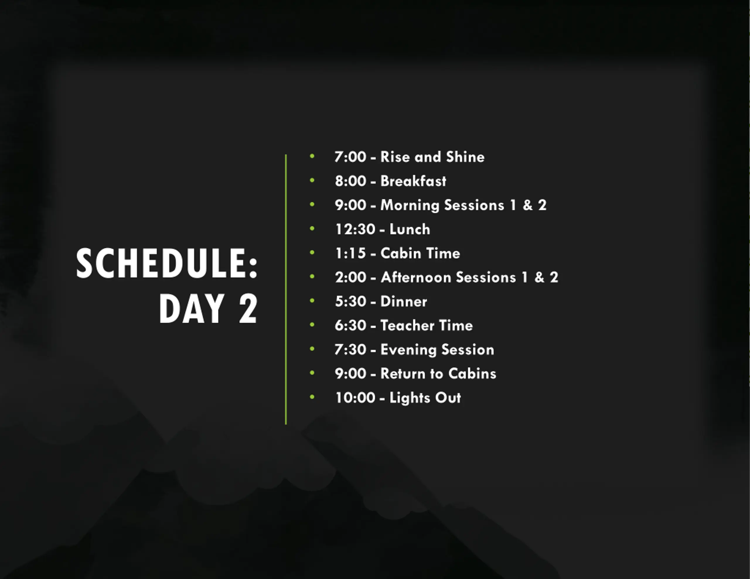 7:00 - Rise and Shine 8:00 - Breakfast 9:00 - Morning Sessions 1 & 2 12:30 - Lunch 1:15 - Cabin Time 2:00 - Afternoon Sessions 1 & 2 5:30 - Dinner 6:30 - Teacher Time 7:30 - Evening Session 9:00 - Return to Cabins 10:00 - Lights Out SCHEDULE: DAY 2