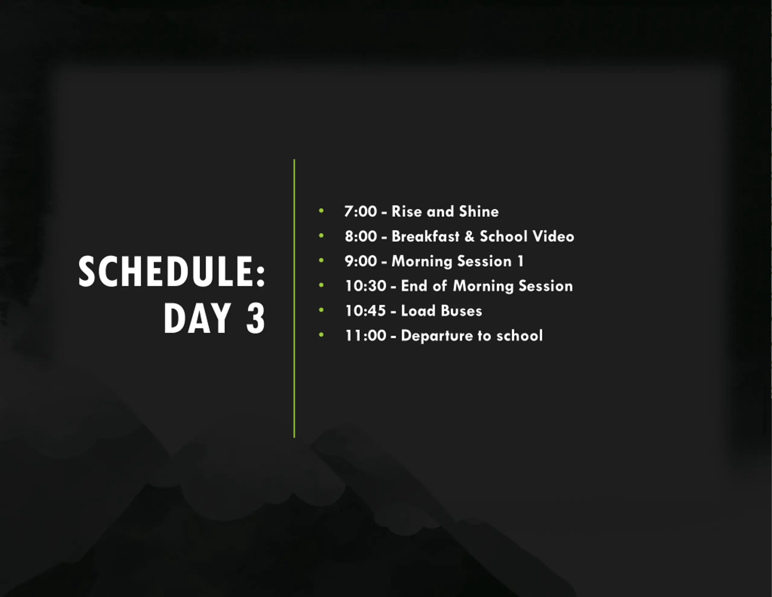 7:00 - Rise and Shine 8:00 - Breakfast & School Video 9:00 - Morning Session 1 10:30 - End of Morning Session 10:45 - Load Buses 11:00 - Departure to school SCHEDULE: DAY 3
