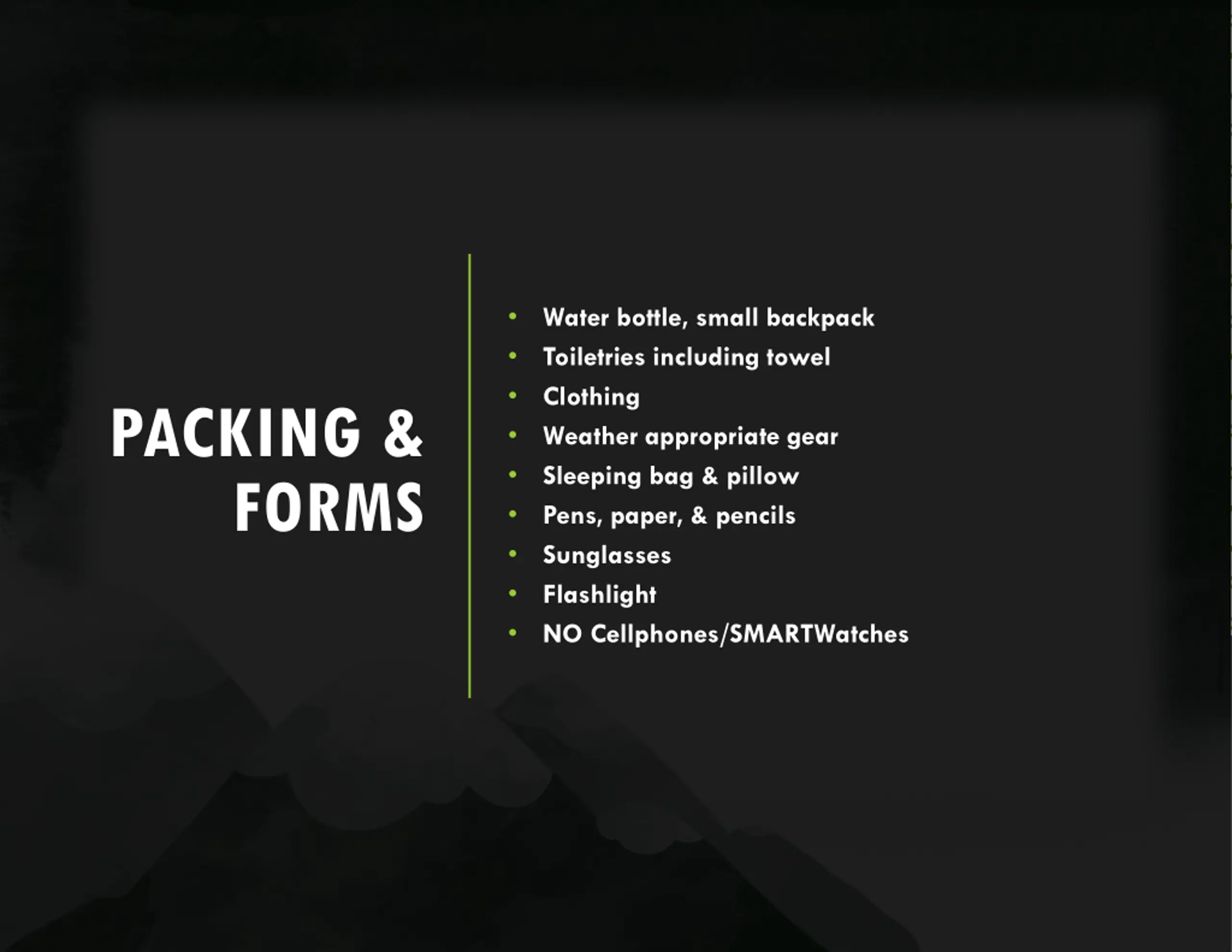 Water bottle, small backpack Toiletries including towel Clothing Weather appropriate gear Sleeping bag & pillow Pens, paper, & pencils Sunglasses Flashlight NO Cellphones/SMARTWatches PACKING & FORMS