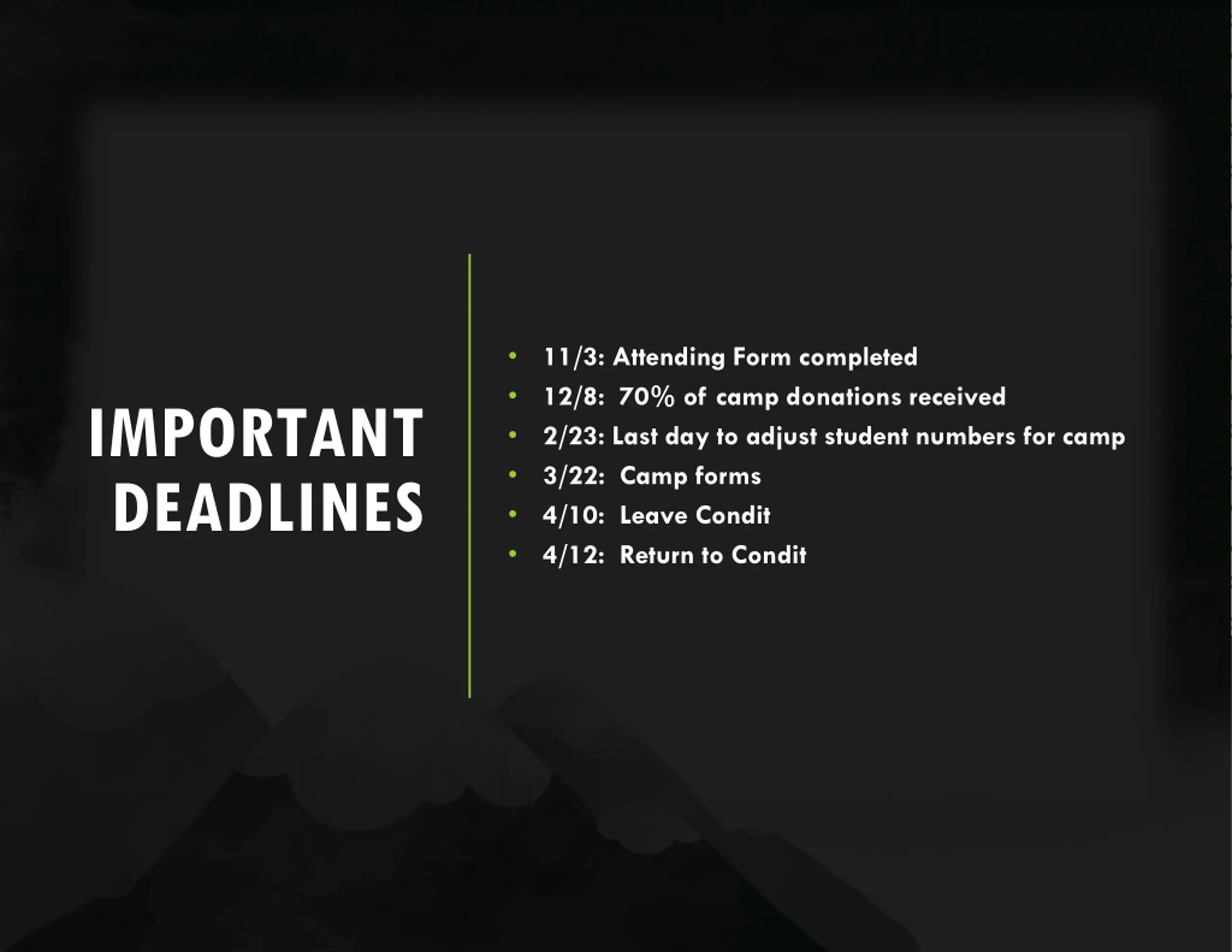 11/3: Attending Form completed 12/8: 70% of camp donations received 2/23: Last day to adjust student numbers for camp 3/22: Camp forms 4/10: Leave Condit 4/12: Return to Condit IMPORTANT DEADLINES