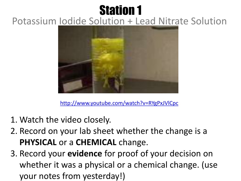 Station 1 Potassium Iodide Solution + Lead Nitrate Solution http://www.youtube.com/watch?v=RYgPxJVlCpc 1. Watch the video closely. 2. Record on your lab sheet whether the change is a PHYSICAL or a CHEMICAL change. 3. Record your evidence for proof of your decision on whether it was a physical or a chemical change. (use your notes from yesterday!)