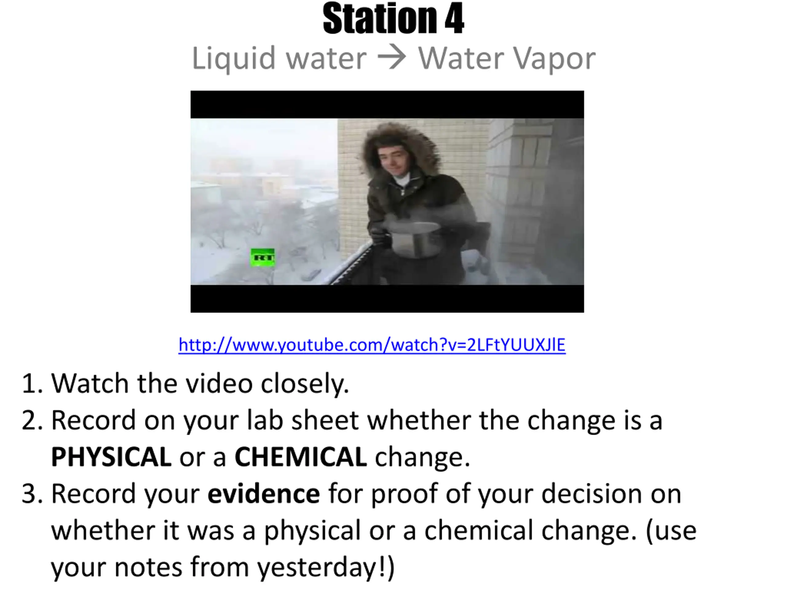 Station 4 Liquid water Water Vapor http://www.youtube.com/watch?v=2LFtYUUXJlE 1. Watch the video closely. 2. Record on your lab sheet whether the change is a PHYSICAL or a CHEMICAL change. 3. Record your evidence for proof of your decision on whether it was a physical or a chemical change. (use your notes from yesterday!)
