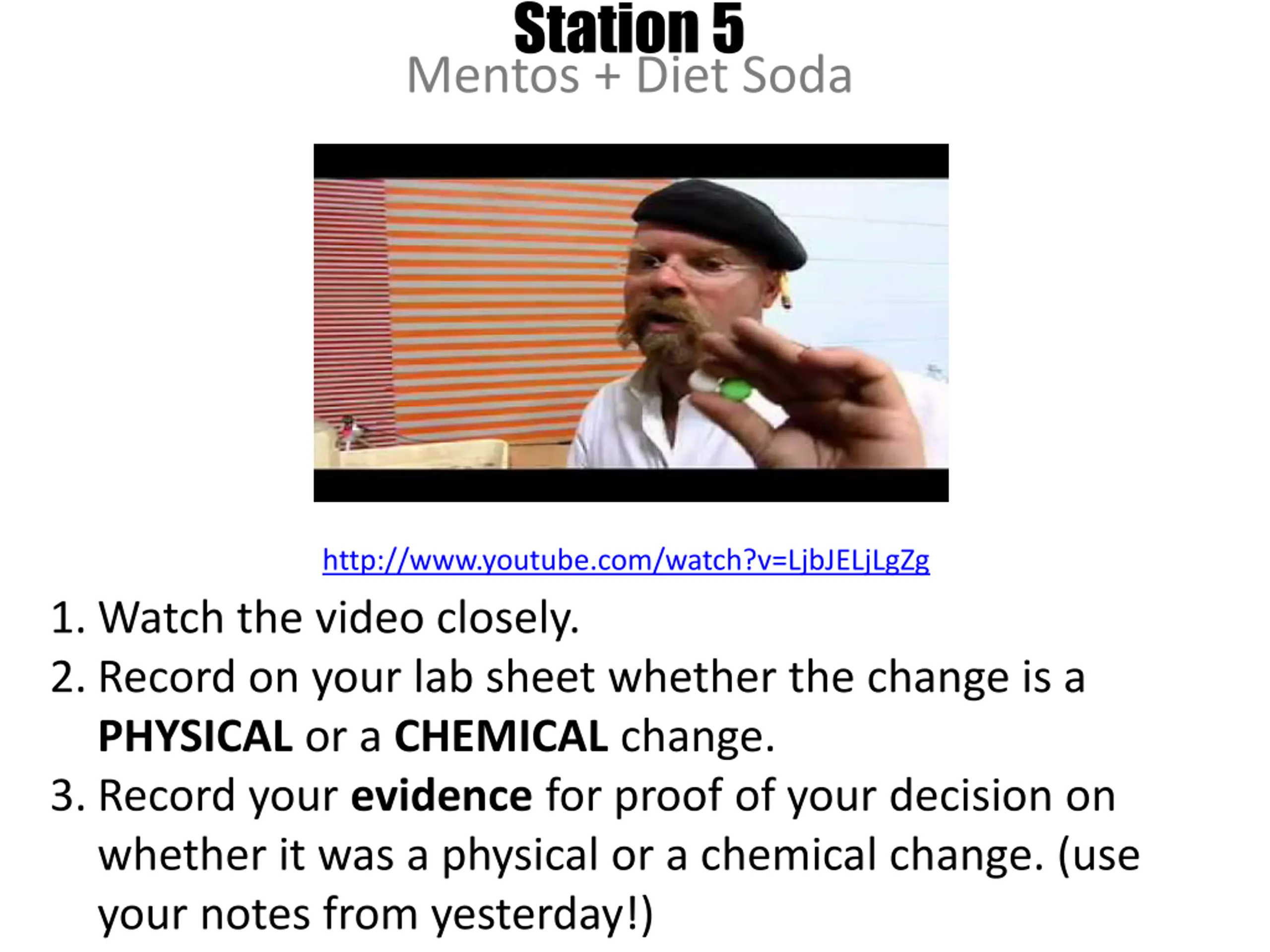 Station 5 Mentos + Diet Soda http://www.youtube.com/watch?v=LjbJELjLgZg 1. Watch the video closely. 2. Record on your lab sheet whether the change is a PHYSICAL or a CHEMICAL change. 3. Record your evidence for proof of your decision on whether it was a physical or a chemical change. (use your notes from yesterday!)