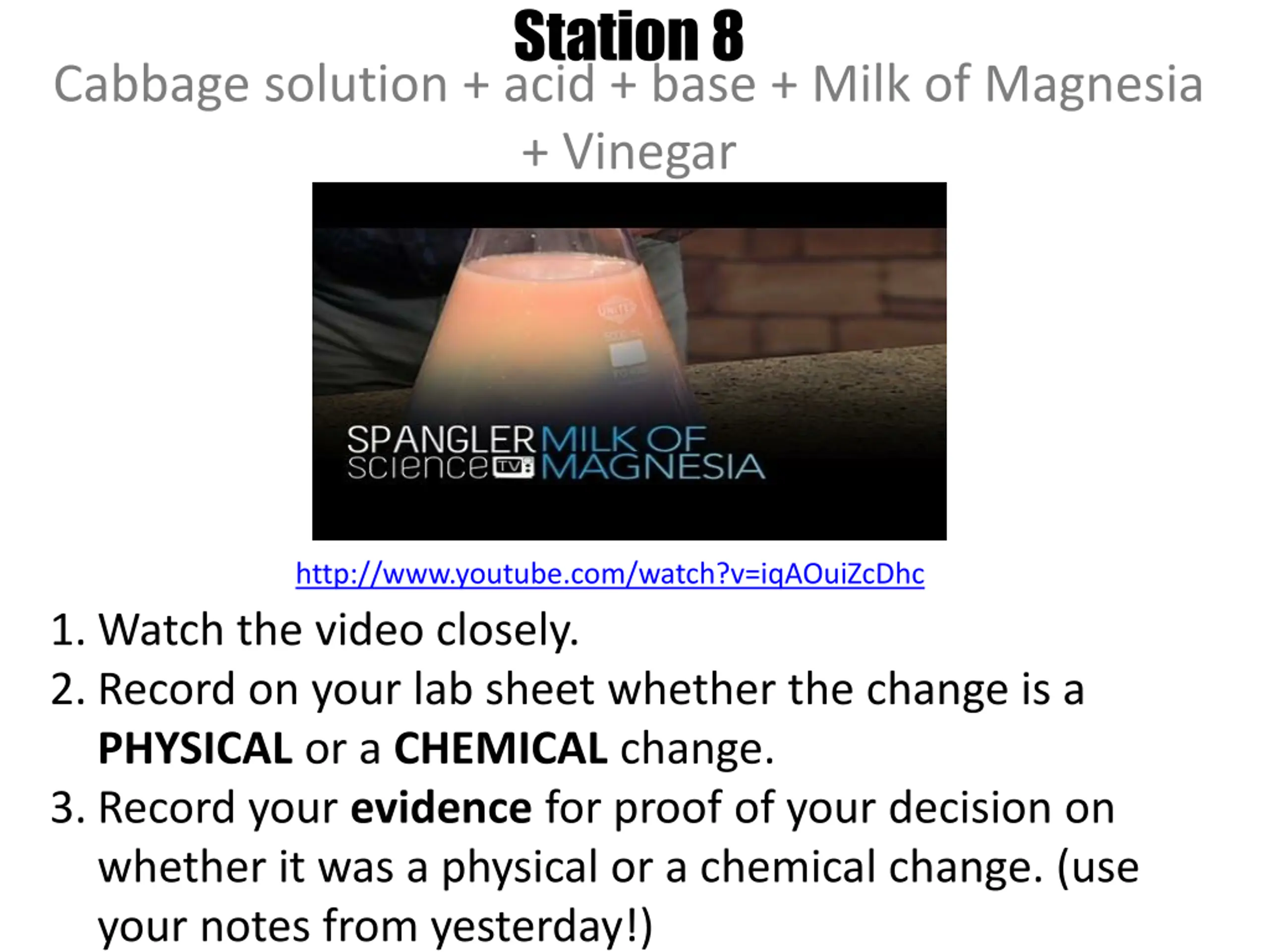 Station 8 Cabbage solution + acid + base + Milk of Magnesia + Vinegar http://www.youtube.com/watch?v=iqAOuiZcDhc 1. Watch the video closely. 2. Record on your lab sheet whether the change is a PHYSICAL or a CHEMICAL change. 3. Record your evidence for proof of your decision on whether it was a physical or a chemical change. (use your notes from yesterday!)