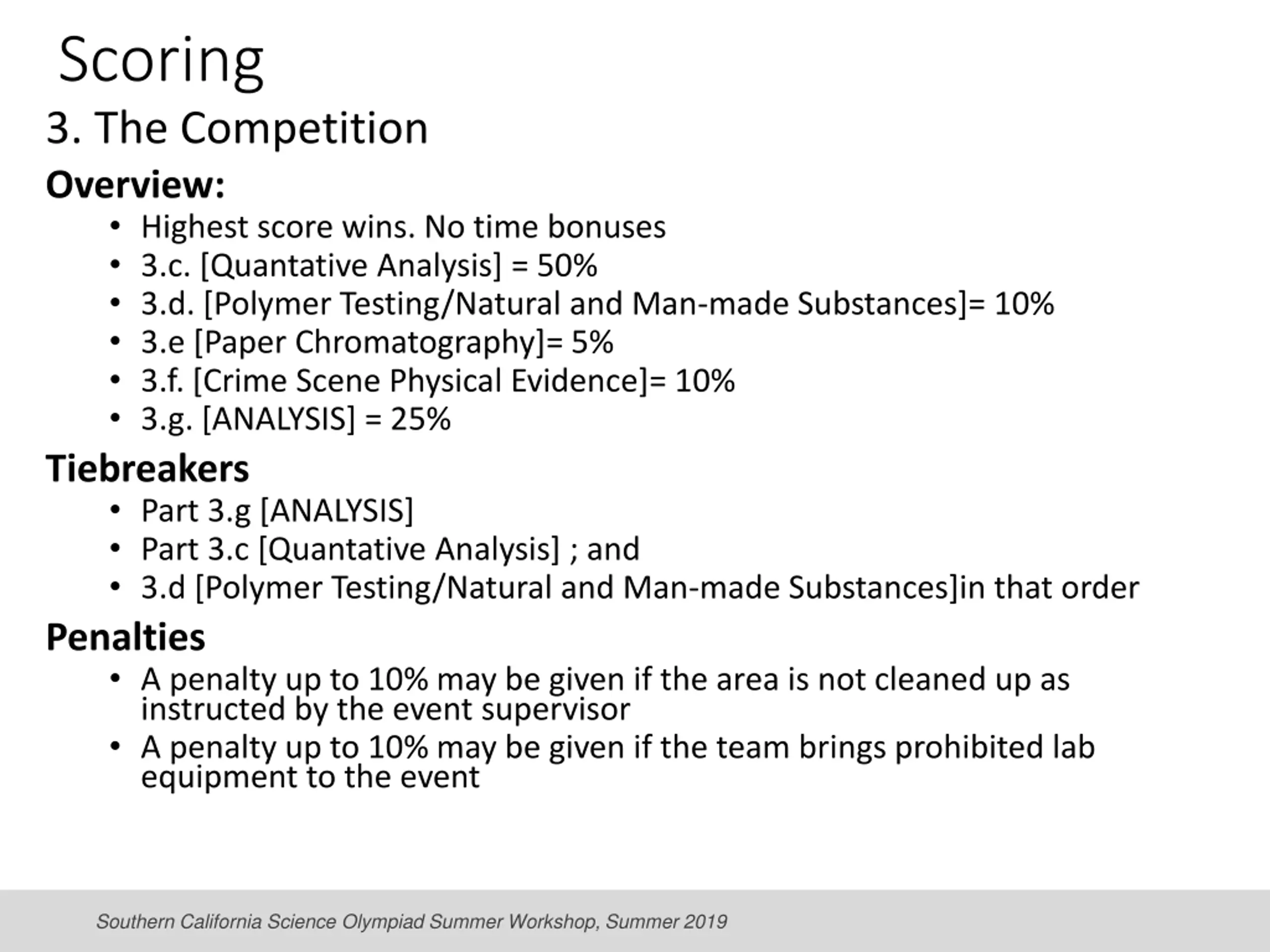 Scoring 3. The Competition Overview: Highest score wins. No time bonuses 3.c. [Quantative Analysis] = 50% 3.d. [Polymer Testing/Natural and Man-made Substances]= 10% 3.e [Paper Chromatography]= 5% 3.f. [Crime Scene Physical Evidence]= 10% 3.g. [ANALYSIS] = 25% Tiebreakers Part 3.g [ANALYSIS] Part 3.c [Quantative Analysis] ; and 3.d [Polymer Testing/Natural and Man-made Substances]in that order Penalties A penalty up to 10% may be given if the area is not cleaned up as instructed by the event supervisor A penalty up to 10% may be given if the team brings prohibited lab equipment to the event Southern California Science Olympiad Summer Workshop, Summer 2019