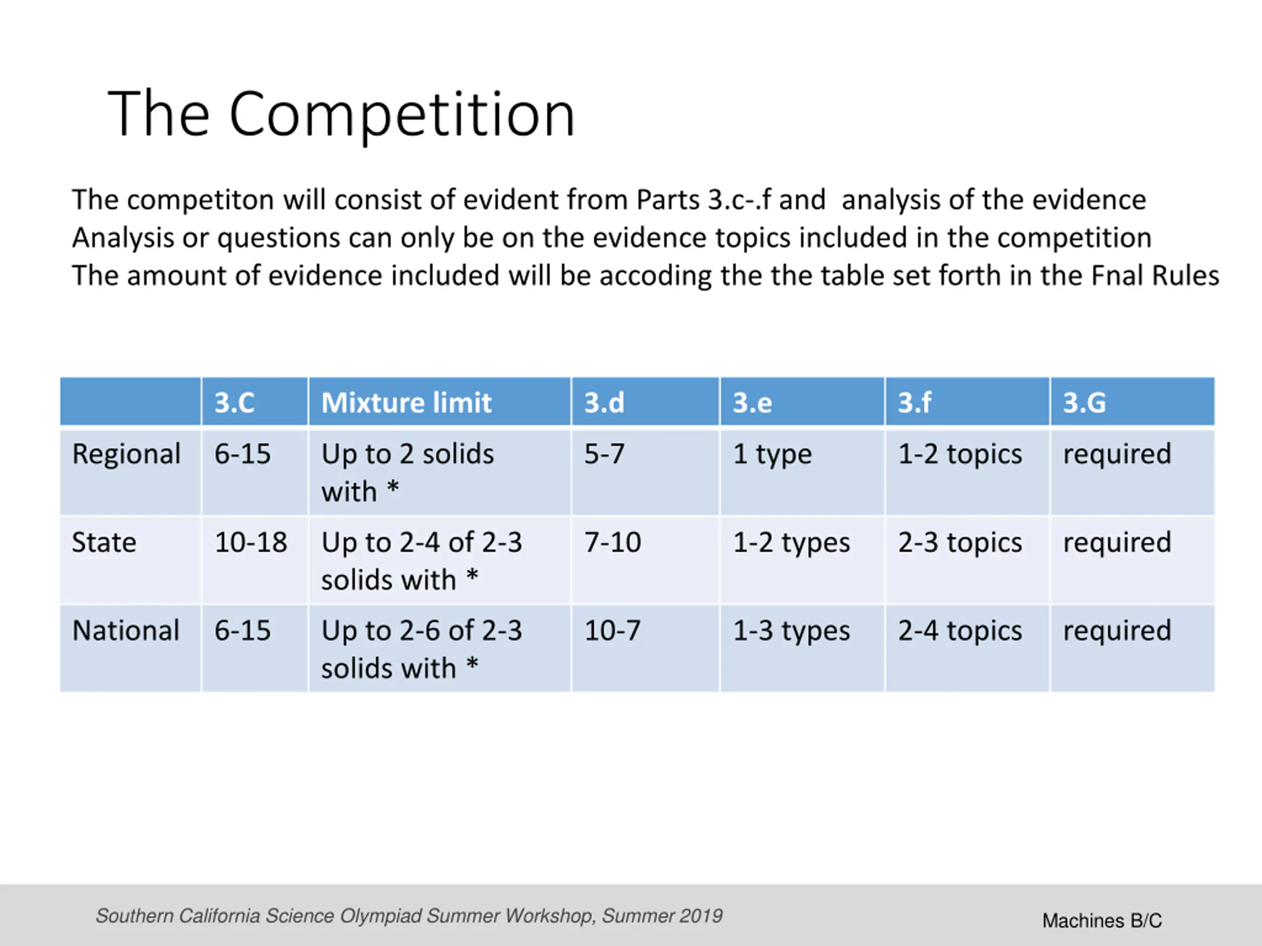 The Competition The competiton will consist of evident from Parts 3.c-.f and analysis of the evidence Analysis or questions can only be on the evidence topics included in the competition The amount of evidence included will be accoding the the table set forth in the Fnal Rules 3.C Mixture limit 3.d 3.e 3.f 3.G Regional 6-15 Up to 2 solids with * 5-7 1 type 1-2 topics required State 10-18 Up to 2-4 of 2-3 solids with * 7-10 1-2 types 2-3 topics required National 6-15 Up to 2-6 of 2-3 solids with * 10-7 1-3 types 2-4 topics required Southern California Science Olympiad Summer Workshop, Summer 2019 Machines B/C