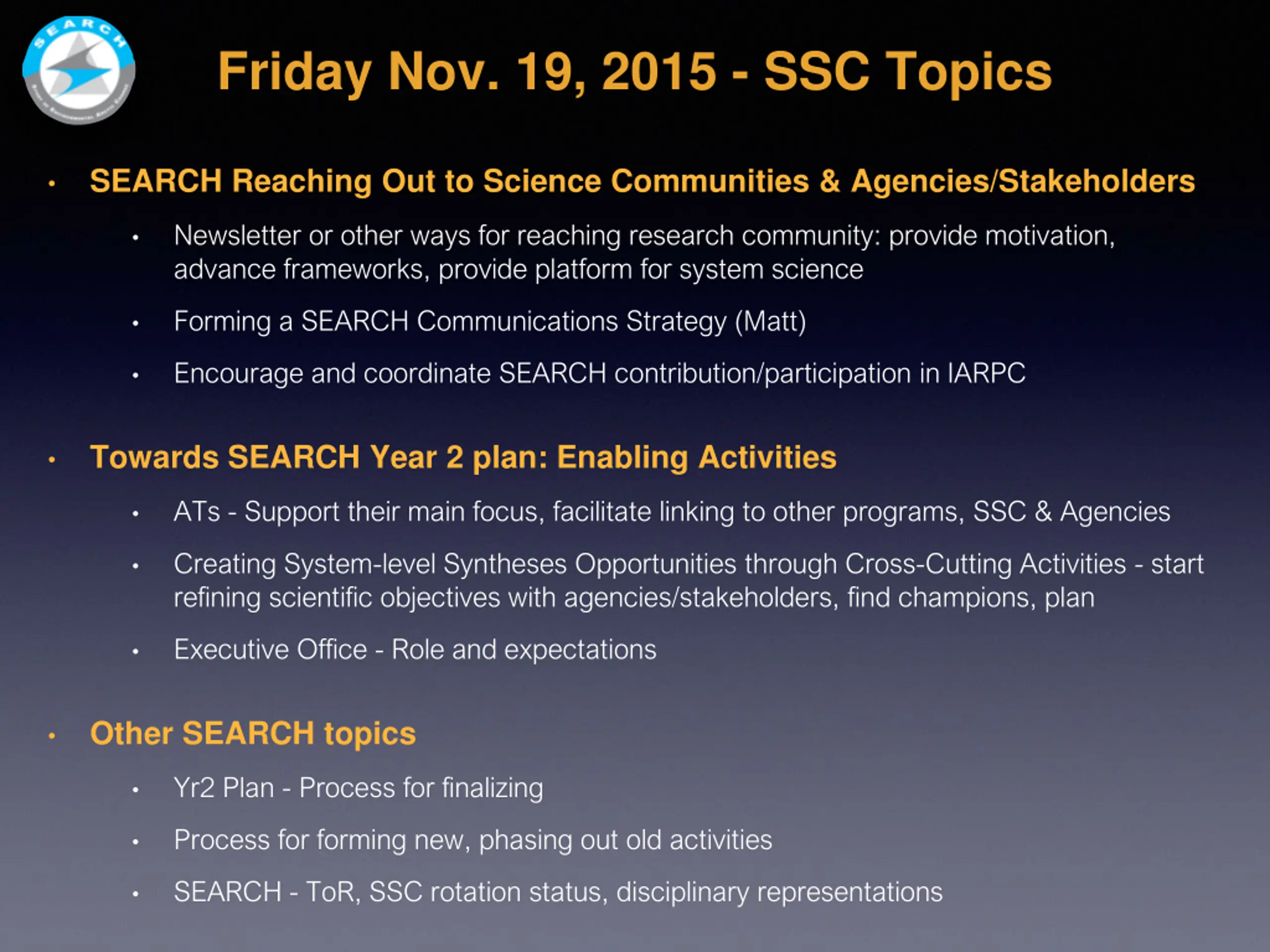 Friday Nov. 19, 2015 - SSC Topics SEARCH Reaching Out to Science Communities & Agencies/Stakeholders Newsletter or other ways for reaching research community: provide motivation, advance frameworks, provide platform for system science Forming a SEARCH Communications Strategy (Matt) Encourage and coordinate SEARCH contribution/participation in IARPC Towards SEARCH Year 2 plan: Enabling Activities ATs - Support their main focus, facilitate linking to other programs, SSC & Agencies Creating System-level Syntheses Opportunities through Cross-Cutting Activities - start refining scientific objectives with agencies/stakeholders, find champions, plan Executive Office - Role and expectations Other SEARCH topics Yr2 Plan - Process for finalizing Process for forming new, phasing out old activities SEARCH - ToR, SSC rotation status, disciplinary representations