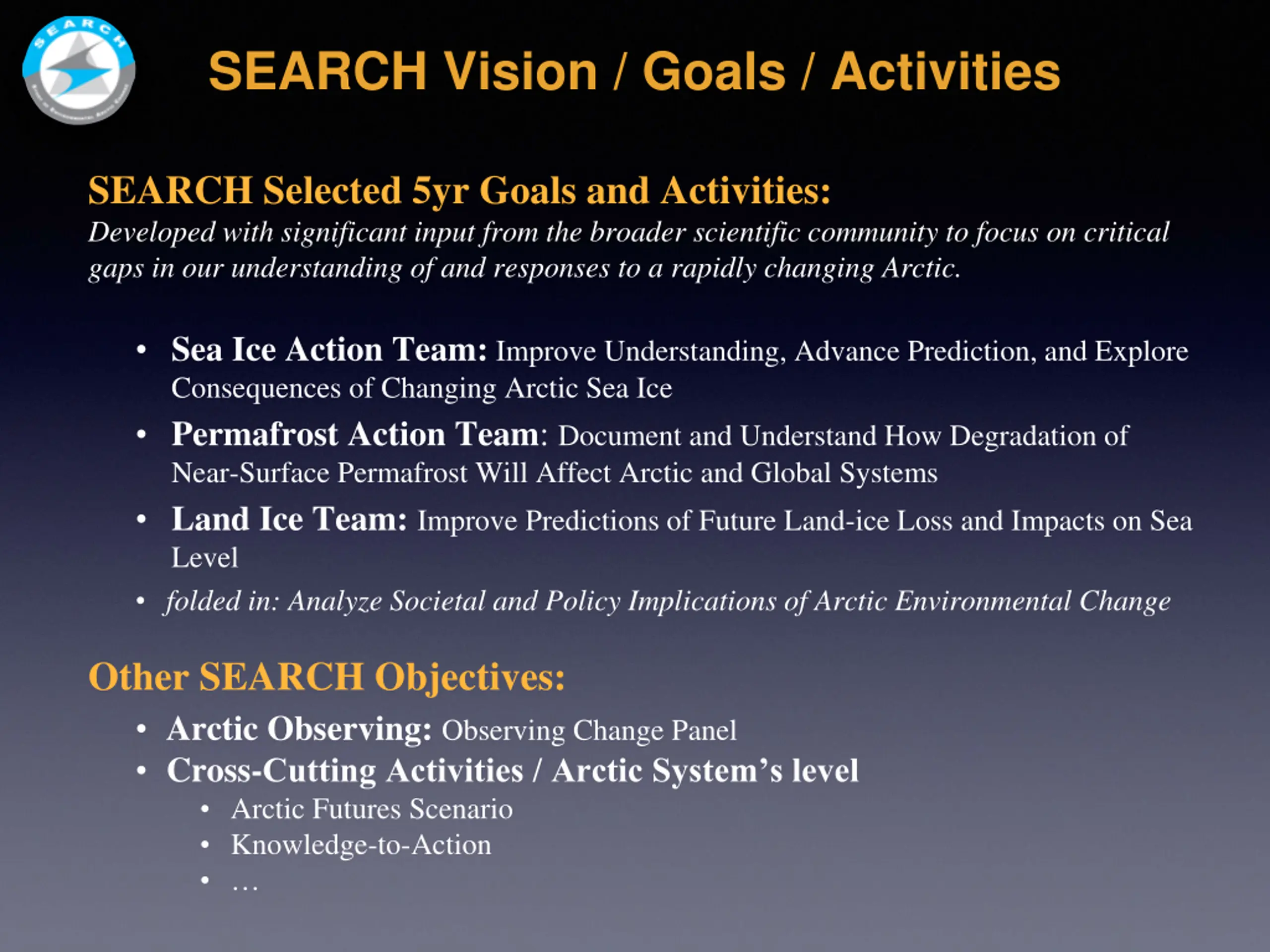 SEARCH Vision / Goals / Activities SEARCH Selected 5yr Goals and Activities: Developed with significant input from the broader scientific community to focus on critical gaps in our understanding of and responses to a rapidly changing Arctic. Sea Ice Action Team:Improve Understanding, Advance Prediction, and Explore Consequences of Changing Arctic Sea Ice Permafrost Action Team: Document and Understand How Degradation of Near-Surface Permafrost Will Affect Arctic and Global Systems Land Ice Team:Improve Predictions of Future Land-ice Loss and Impacts on Sea Level folded in: Analyze Societal and Policy Implications of Arctic Environmental Change Other SEARCH Objectives: Arctic Observing: Observing Change Panel Cross-Cutting Activities / Arctic System s level Arctic Futures Scenario Knowledge-to-Action