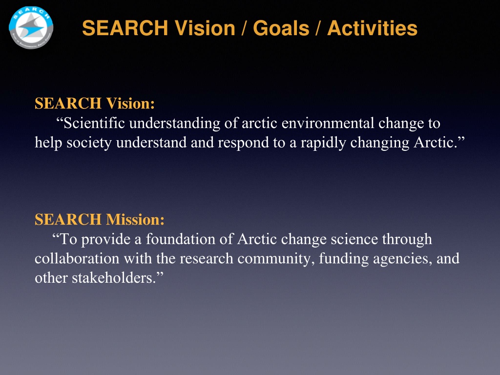 SEARCH Vision / Goals / Activities SEARCH Vision: Scientific understanding of arctic environmental change to help society understand and respond to a rapidly changing Arctic. SEARCH Mission: To provide a foundation of Arctic change science through collaboration with the research community, funding agencies, and other stakeholders.