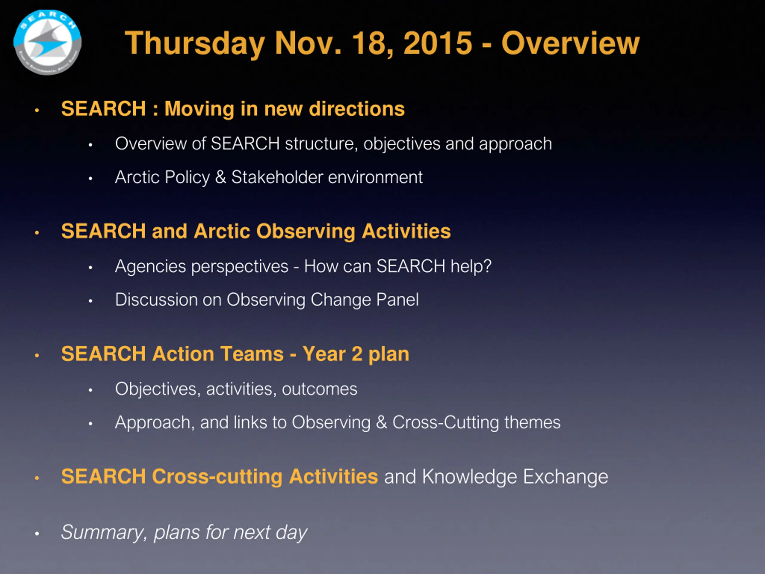 Thursday Nov. 18, 2015 - Overview SEARCH : Moving in new directions Overview of SEARCH structure, objectives and approach Arctic Policy & Stakeholder environment SEARCH and Arctic Observing Activities Agencies perspectives - How can SEARCH help? Discussion on Observing Change Panel SEARCH Action Teams - Year 2 plan Objectives, activities, outcomes Approach, and links to Observing & Cross-Cutting themes SEARCH Cross-cutting Activities and Knowledge Exchange Summary, plans for next day