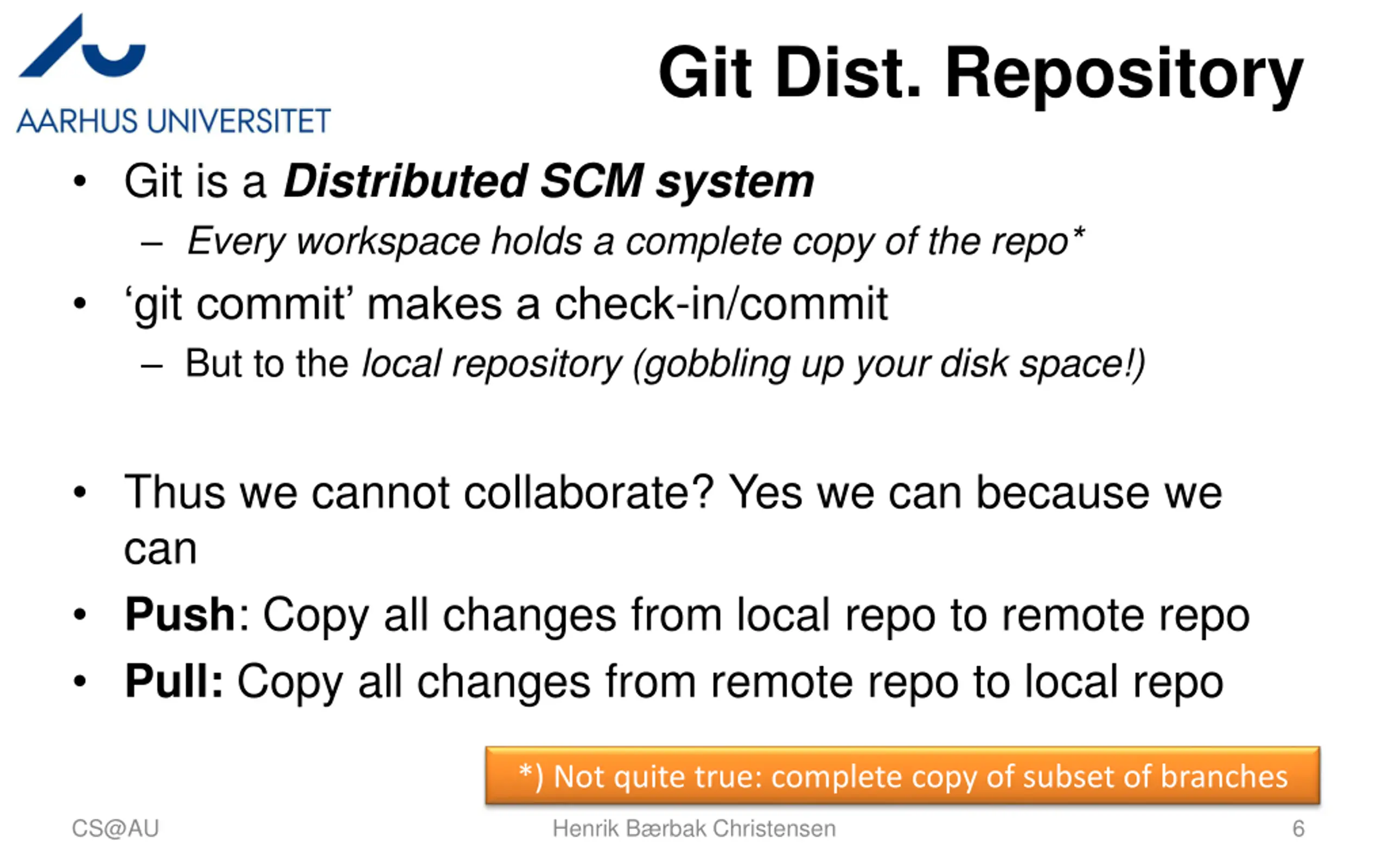 Git Dist. Repository Git is a Distributed SCM system Every workspace holds a complete copy of the repo* git commit makes a check-in/commit But to the local repository (gobbling up your disk space!) Thus we cannot collaborate? Yes we can because we can Push: Copy all changes from local repo to remote repo Pull: Copy all changes from remote repo to local repo *) Not quite true: complete copy of subset of branches CS@AU Henrik B rbak Christensen 6