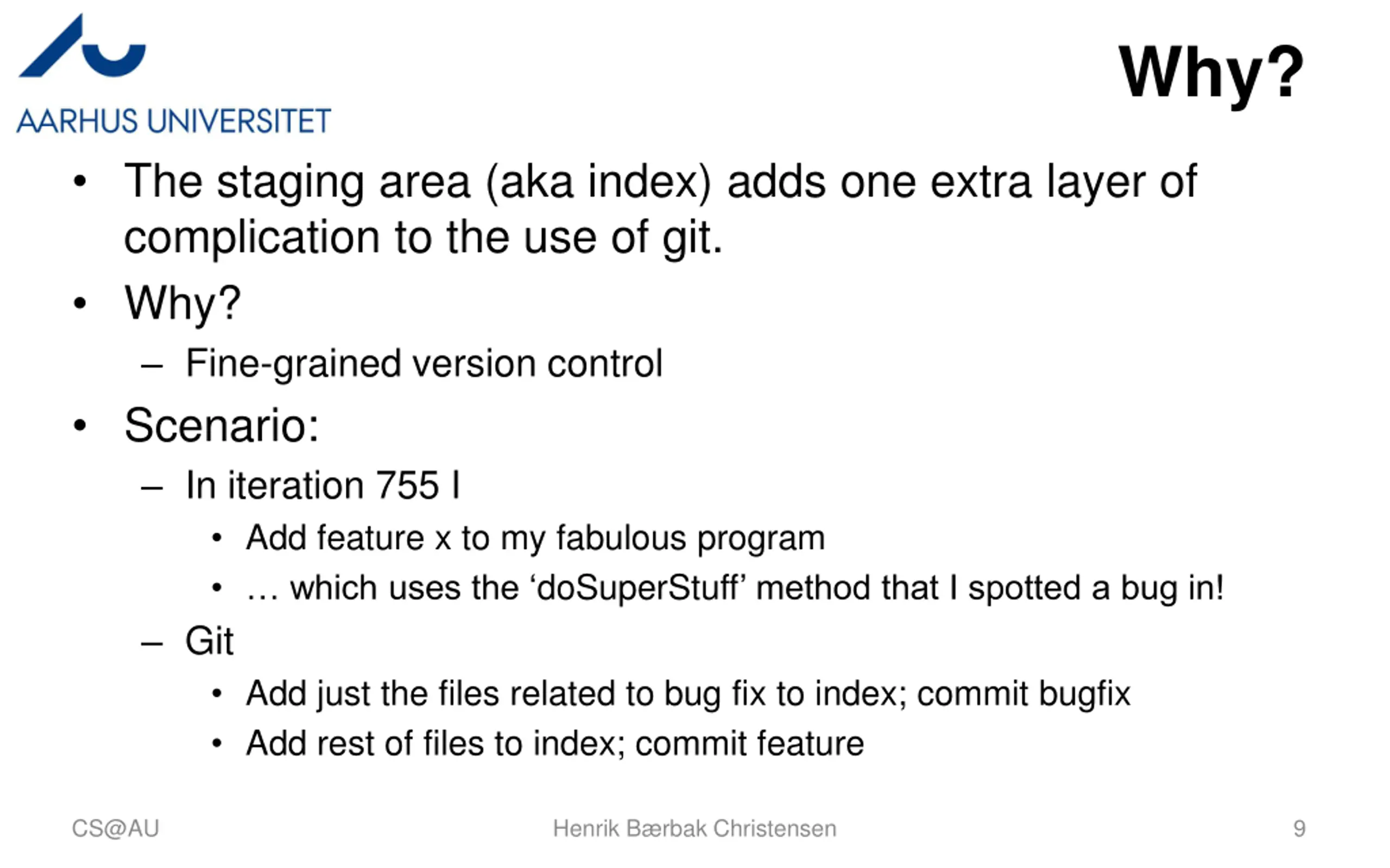 Why? The staging area (aka index) adds one extra layer of complication to the use of git. Why? Fine-grained version control Scenario: In iteration 755 I Add feature x to my fabulous program which uses the doSuperStuff method that I spotted a bug in! Git Add just the files related to bug fix to index; commit bugfix Add rest of files to index; commit feature CS@AU Henrik B rbak Christensen 9