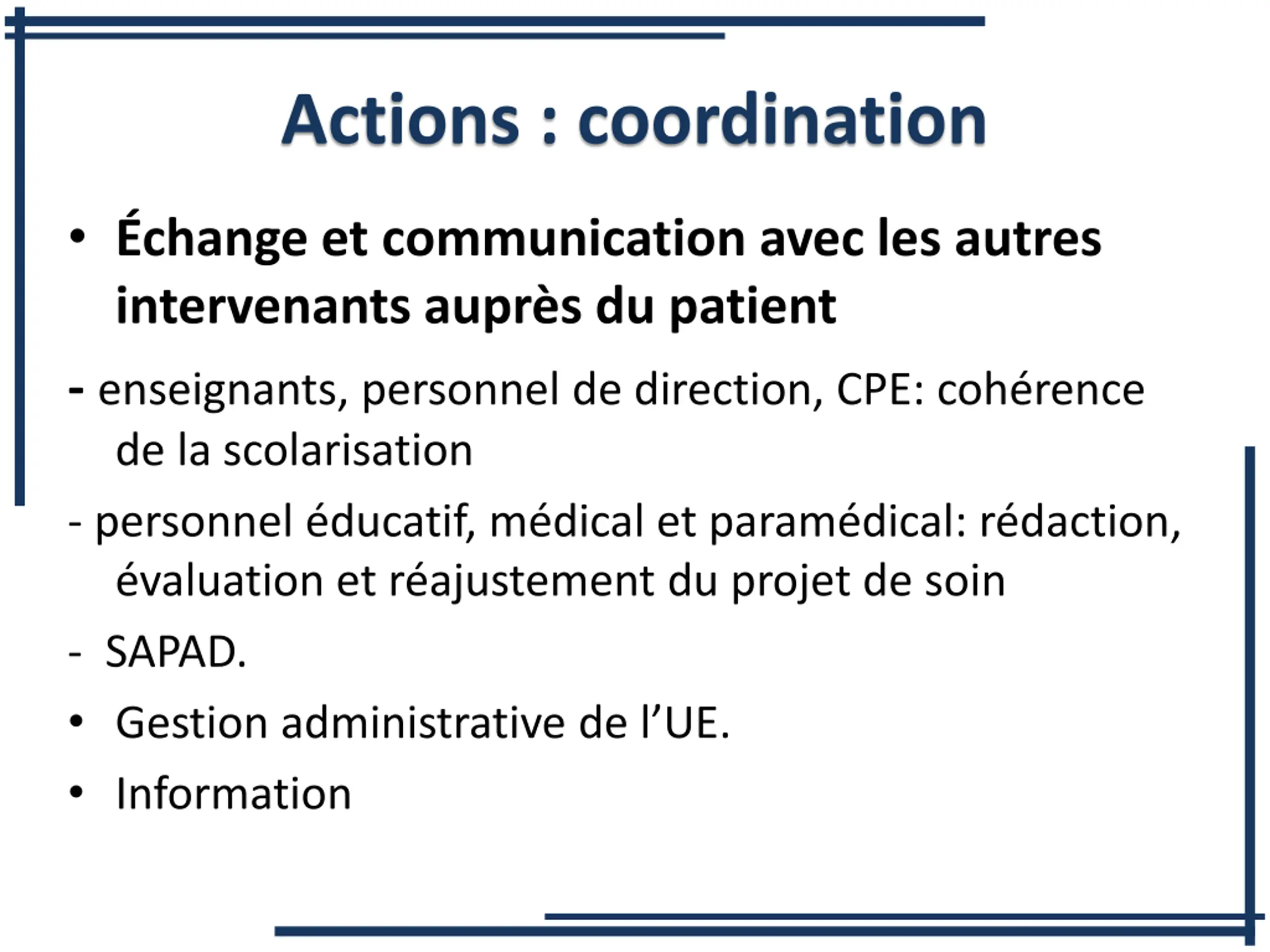 Actions : coordination change et communication avec les autres intervenants aupr s du patient - enseignants, personnel de direction, CPE: coh rence de la scolarisation - personnel ducatif, m dical et param dical: r daction, valuation et r ajustement du projet de soin - SAPAD. Gestion administrative de l UE. Information