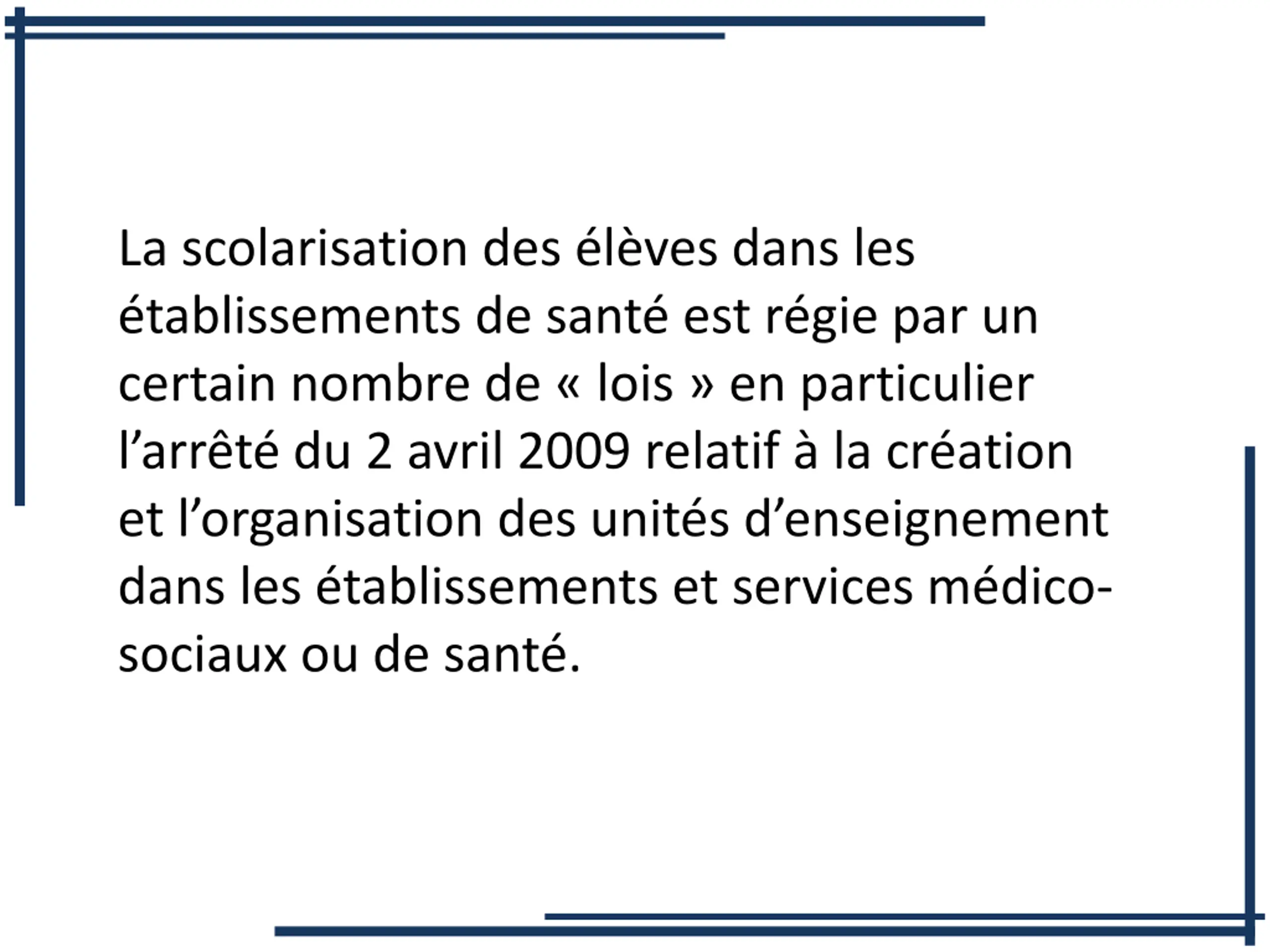 La scolarisation des lves dans les tablissements de sant est r gie par un certain nombre de lois en particulier l arr t du 2 avril 2009 relatif la cr ation et l organisation des unit s d enseignement dans les tablissements et services m dico- sociaux ou de sant .
