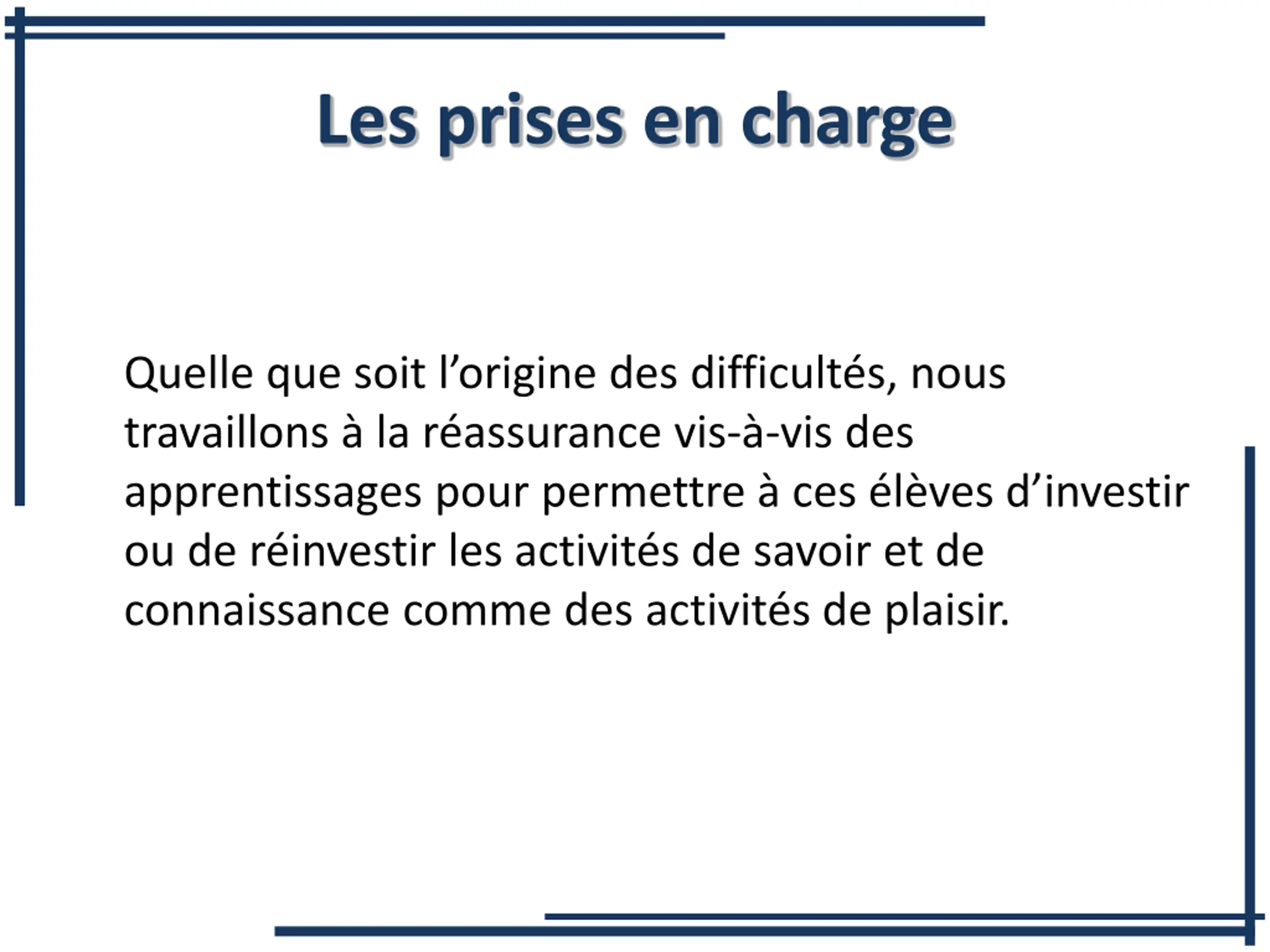 Les prises en charge Quelle que soit l origine des difficult s, nous travaillons la r assurance vis- -vis des apprentissages pour permettre ces l ves d investir ou de r investir les activit s de savoir et de connaissance comme des activit s de plaisir.