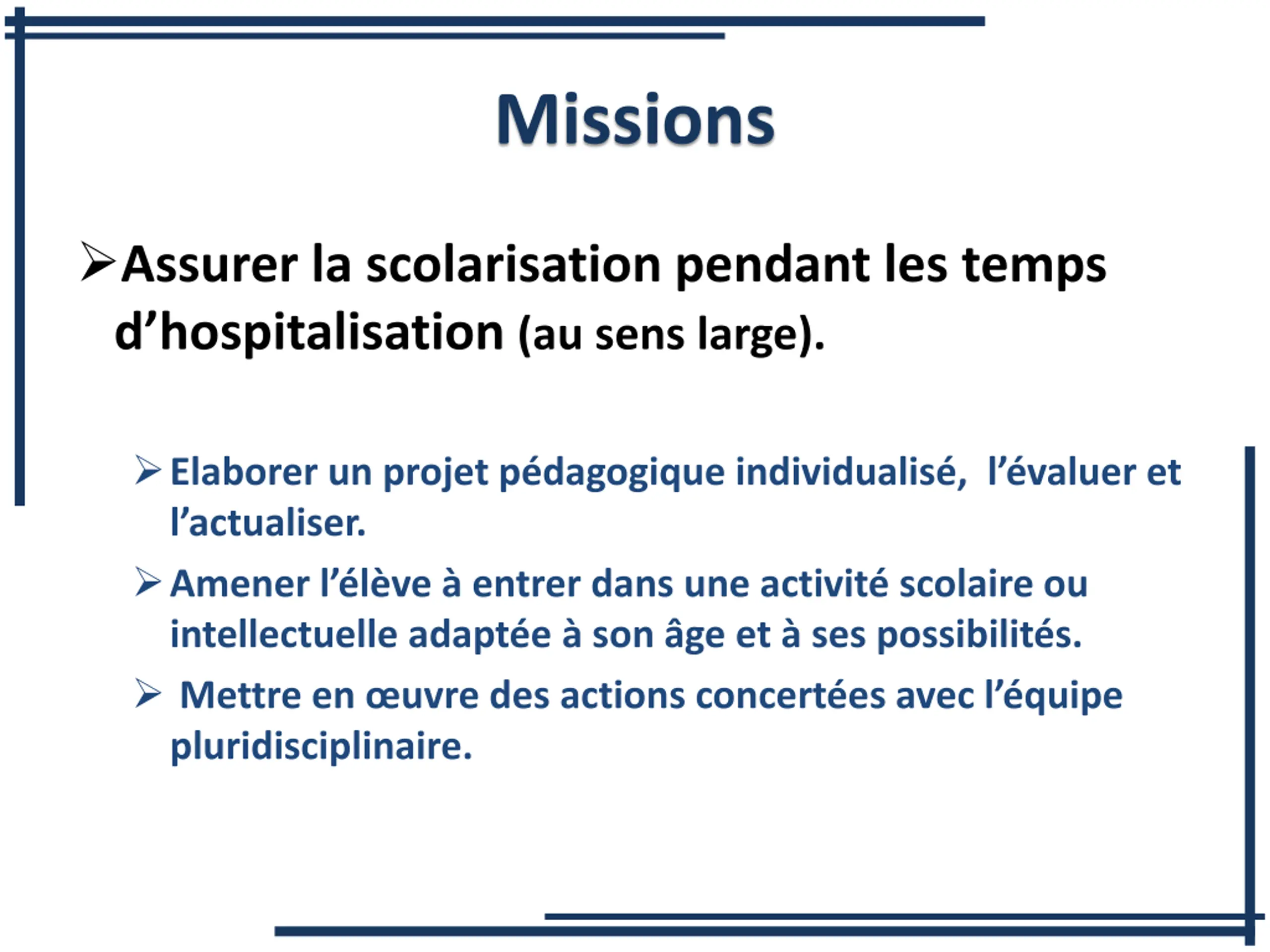 Missions Assurer la scolarisation pendant les temps d hospitalisation (au sens large). Elaborer un projet p dagogique individualis , l valuer et l actualiser. Amener l l ve entrer dans une activit scolaire ou intellectuelle adapt e son ge et ses possibilit s. Mettre en uvre des actions concert es avec l quipe pluridisciplinaire.