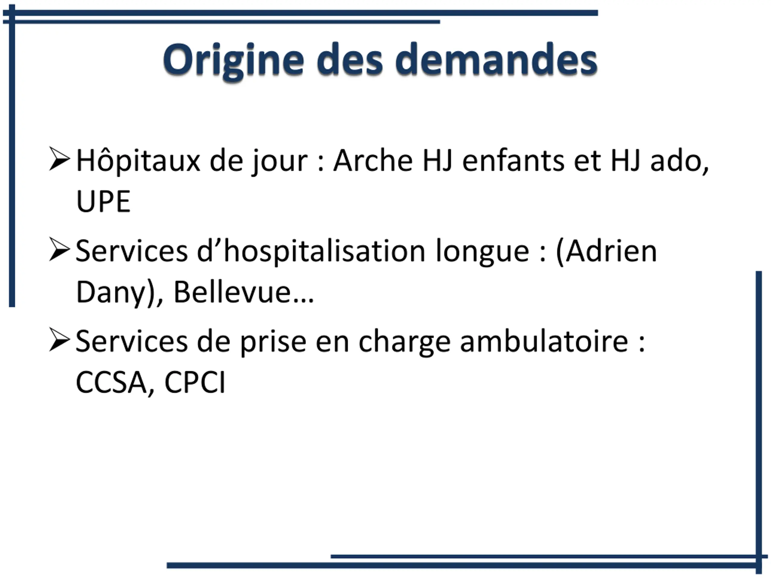 Origine des demandes H pitaux de jour : Arche HJ enfants et HJ ado, UPE Services d hospitalisation longue : (Adrien Dany), Bellevue Services de prise en charge ambulatoire : CCSA, CPCI