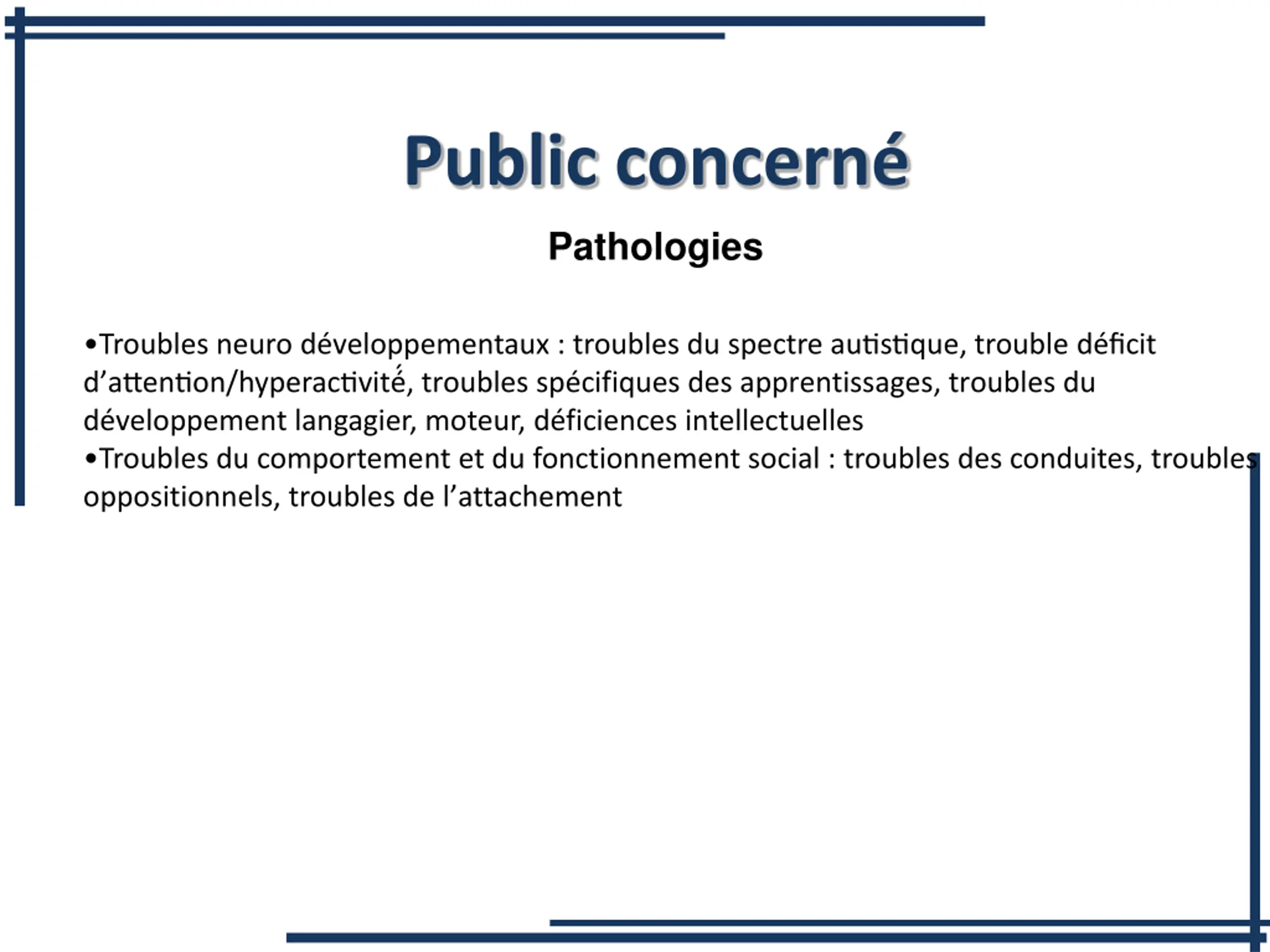 Public concern Pathologies Troubles neuro d veloppementaux : troubles du spectre autistique, trouble d ficit d attention/hyperactivit , troubles sp cifiques des apprentissages, troubles du d veloppement langagier, moteur, d ficiences intellectuelles Troubles du comportement et du fonctionnement social : troubles des conduites, troubles oppositionnels, troubles de l attachement