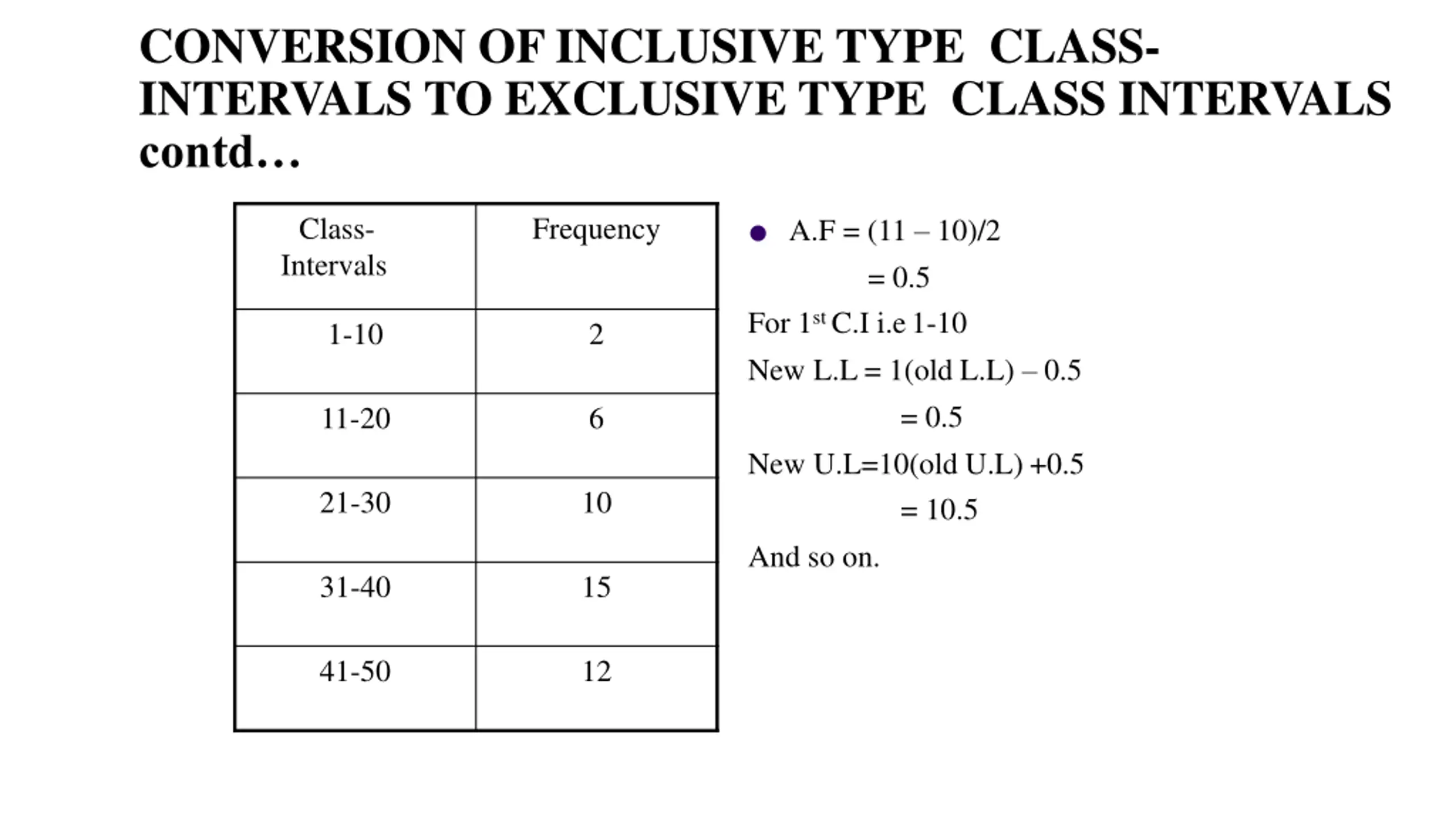CONVERSION OF INCLUSIVE TYPE CLASS- INTERVALS TO EXCLUSIVE TYPE CLASS INTERVALS contd Class- Intervals Frequency A.F = (11 10)/2 = 0.5 For 1st C.I i.e1-10 New L.L = 1(old L.L) 0.5 = 0.5 New U.L=10(old U.L) +0.5 = 10.5 And so on. 1-10 2 11-20 6 21-30 10 31-40 15 41-50 12