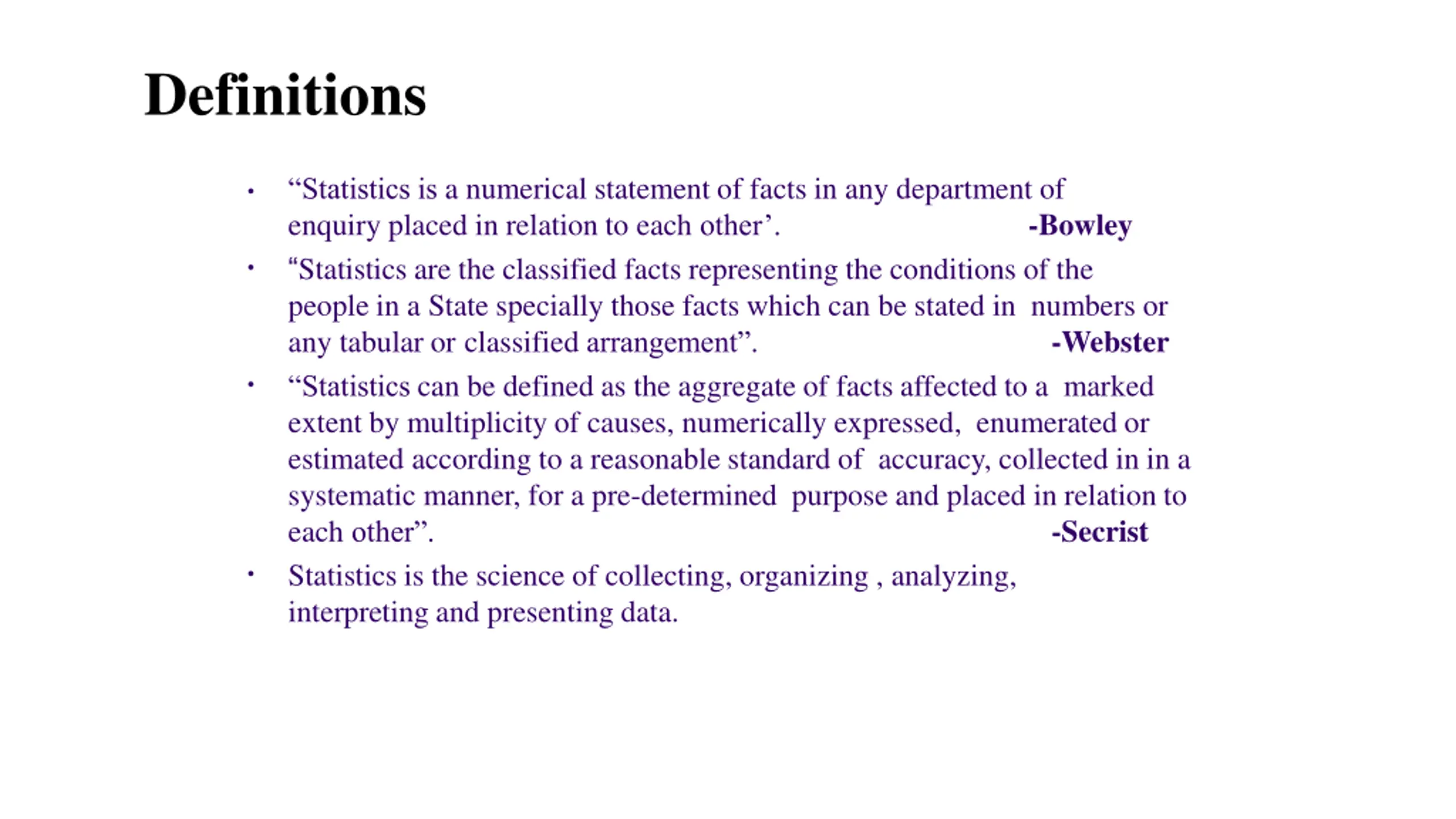 Definitions Statistics is a numerical statement of facts in any department of enquiry placed in relation to each other . Statistics are the classified facts representing the conditions of the people in a State specially those facts which can be stated in numbers or any tabular or classified arrangement . Statistics can be defined as the aggregate of facts affected to a marked extent by multiplicity of causes, numerically expressed, enumerated or estimated according to a reasonable standard of accuracy, collected in in a systematic manner, for a pre-determined purpose and placed in relation to each other . Statistics is the science of collecting, organizing , analyzing, interpreting and presenting data. -Bowley -Webster -Secrist