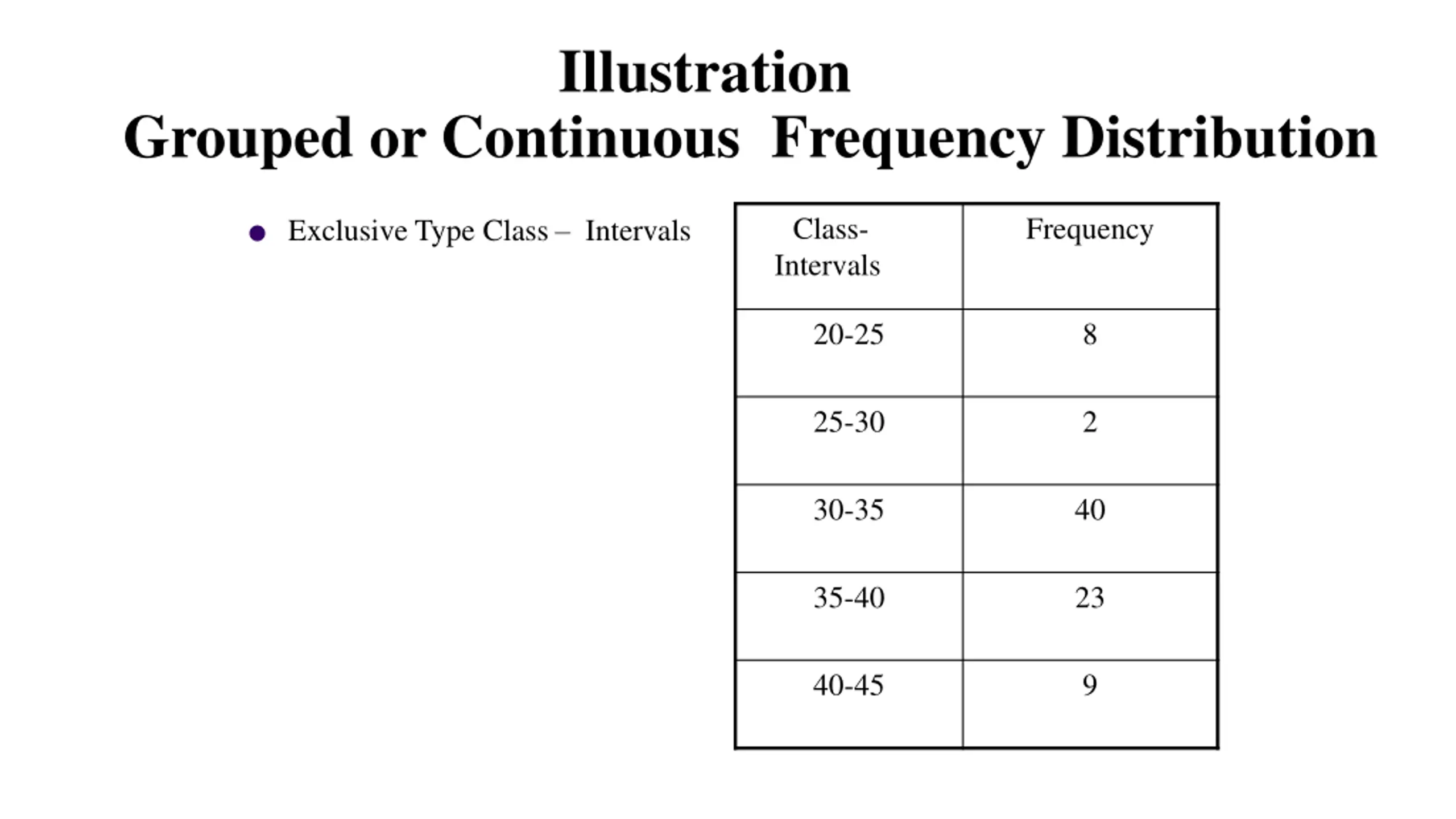 Illustration Grouped or Continuous Frequency Distribution Class- Intervals Frequency Exclusive Type Class Intervals 20-25 8 25-30 2 30-35 40 35-40 23 40-45 9