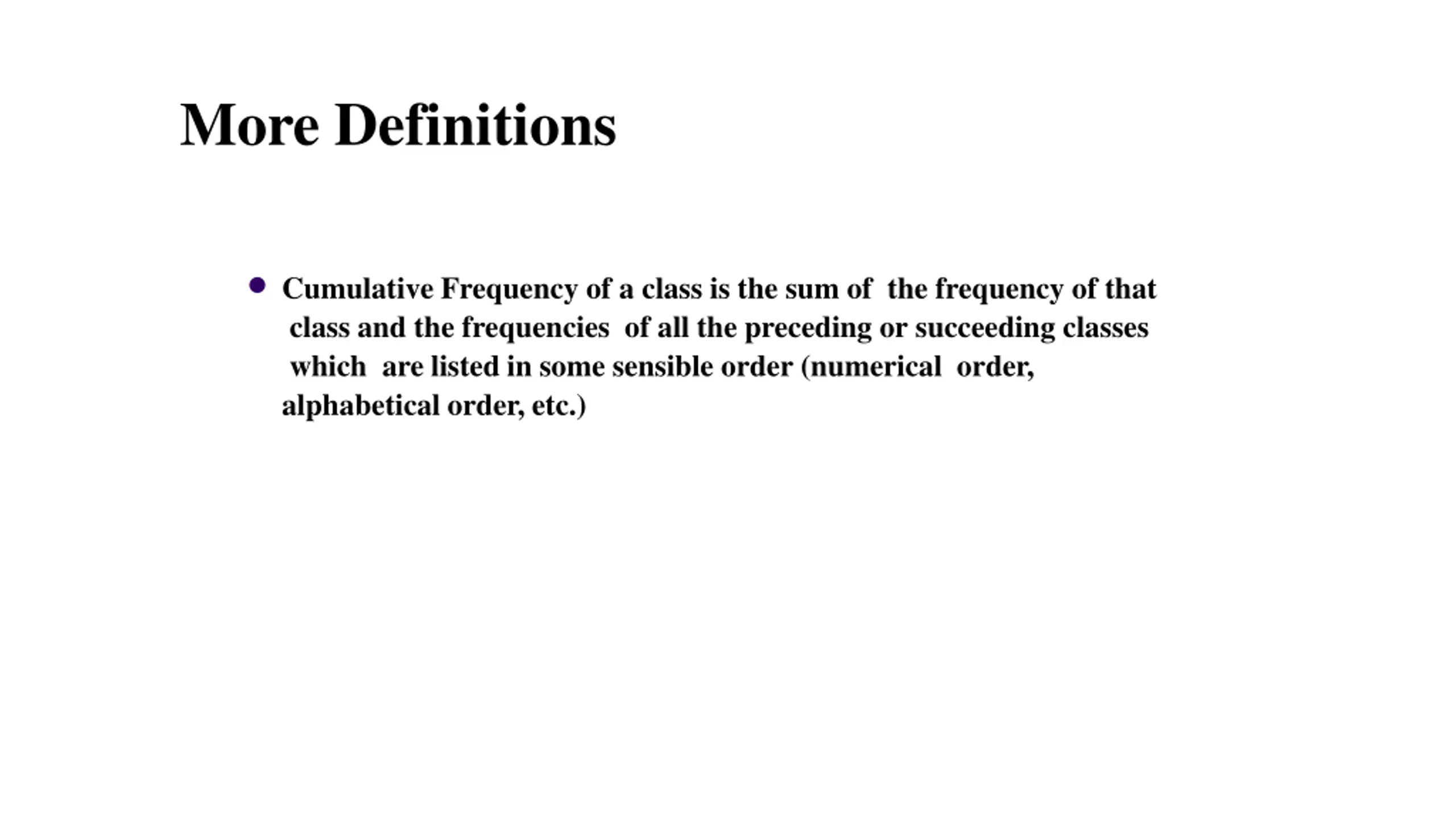 More Definitions Cumulative Frequency of a class is the sum of the frequency of that class and the frequencies of all the preceding or succeeding classes which are listed in some sensible order (numerical order, alphabetical order, etc.)